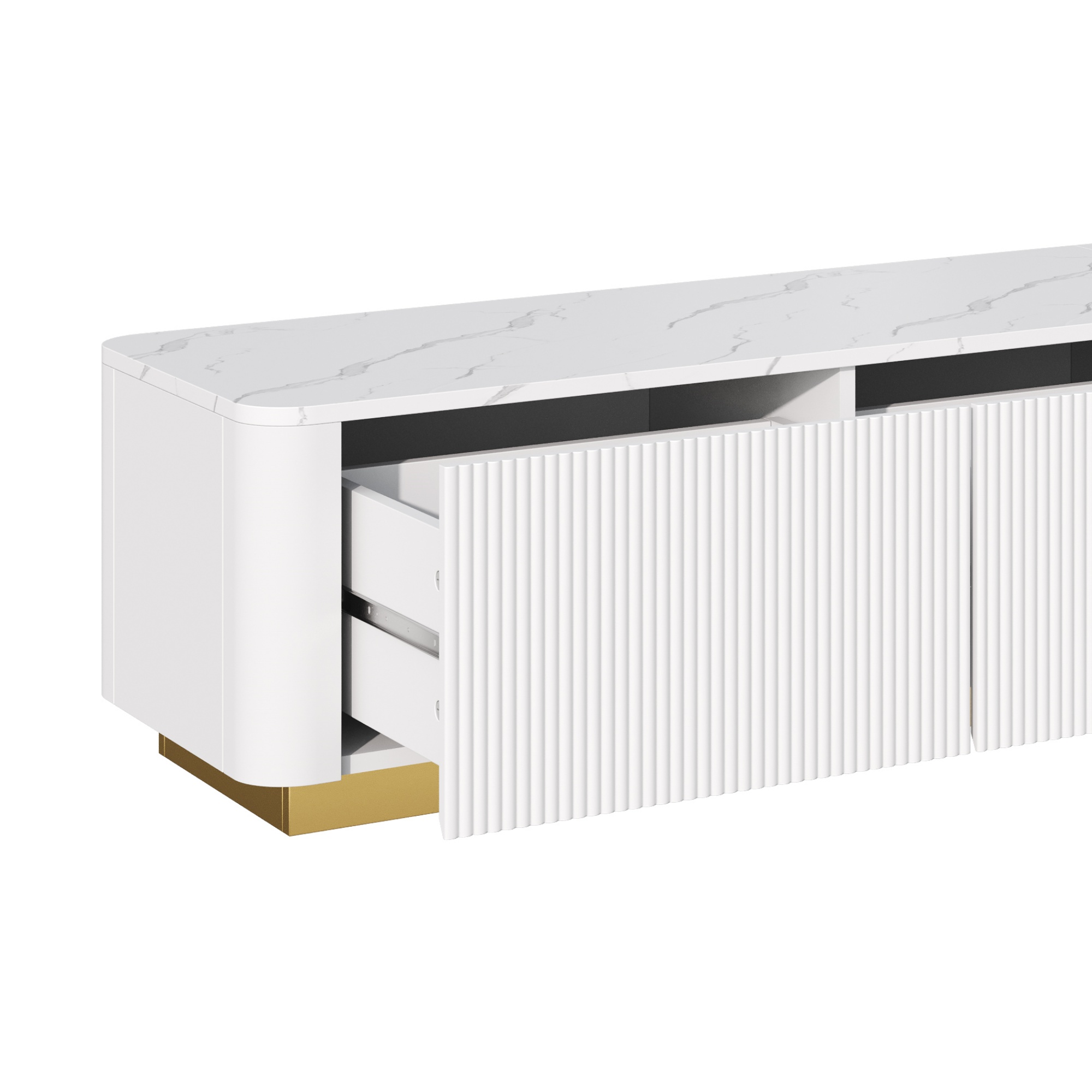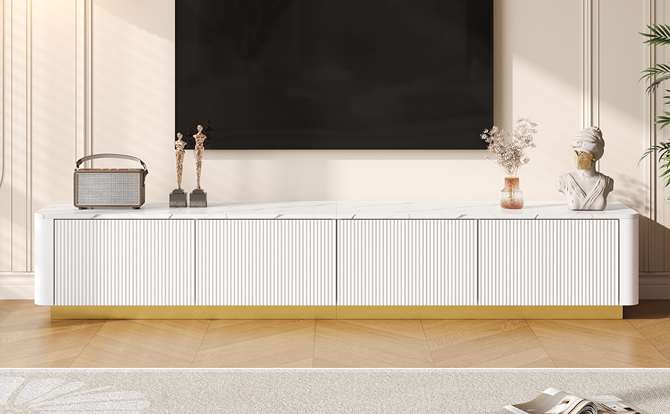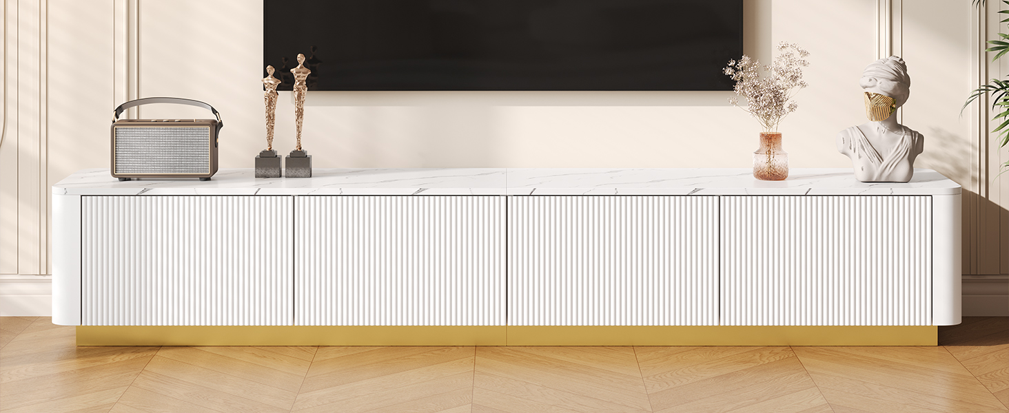Product Name:ON-TREND Luxury Fluted TV Stand for TVs Up to 85", Faux Marble Tabletop Media Console with 4 Drawers, Curved Profile Design, Modern Entertainment Center with Gold Base for Living Room, White