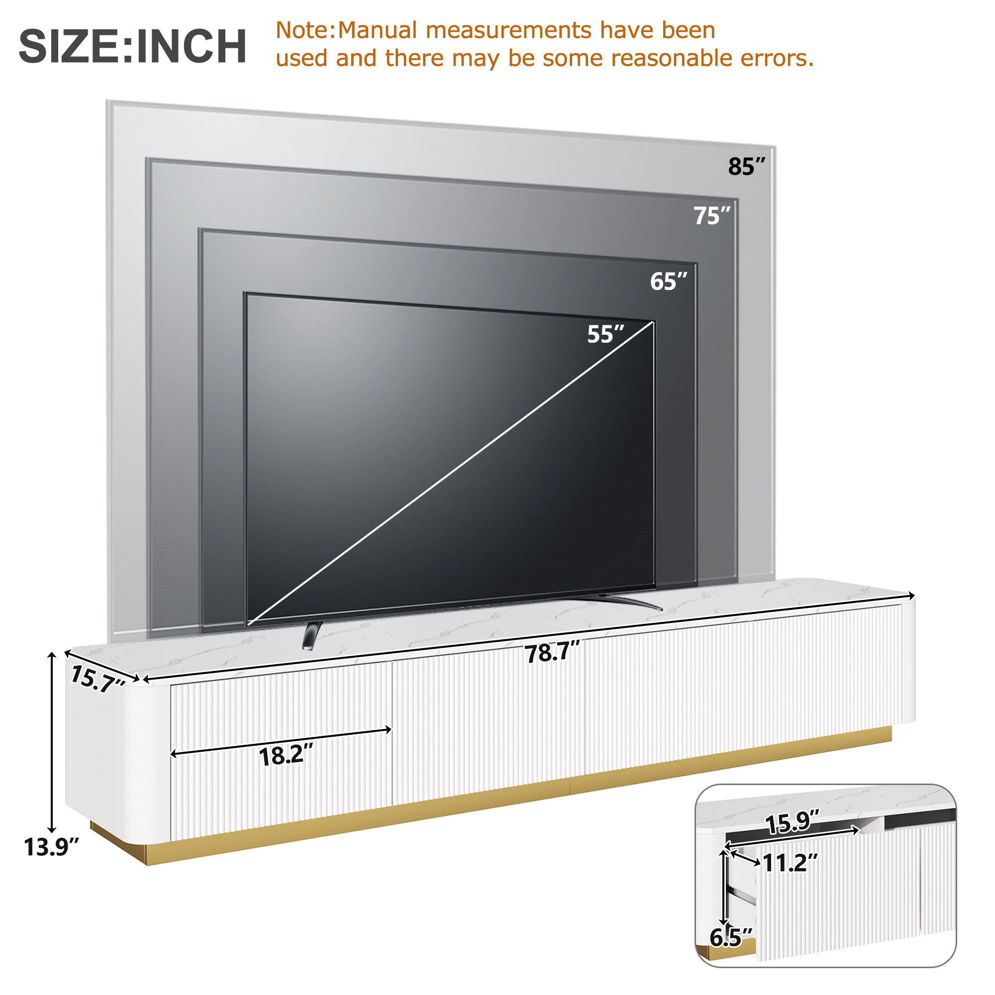 Product Specifications: Basic information Product Type:Single Box Product Product Name:ON-TREND Luxury Fluted TV Stand for TVs Up to 85", Faux Marble Tabletop Media Console with 4 Drawers, Curved Profile Design, Moder...