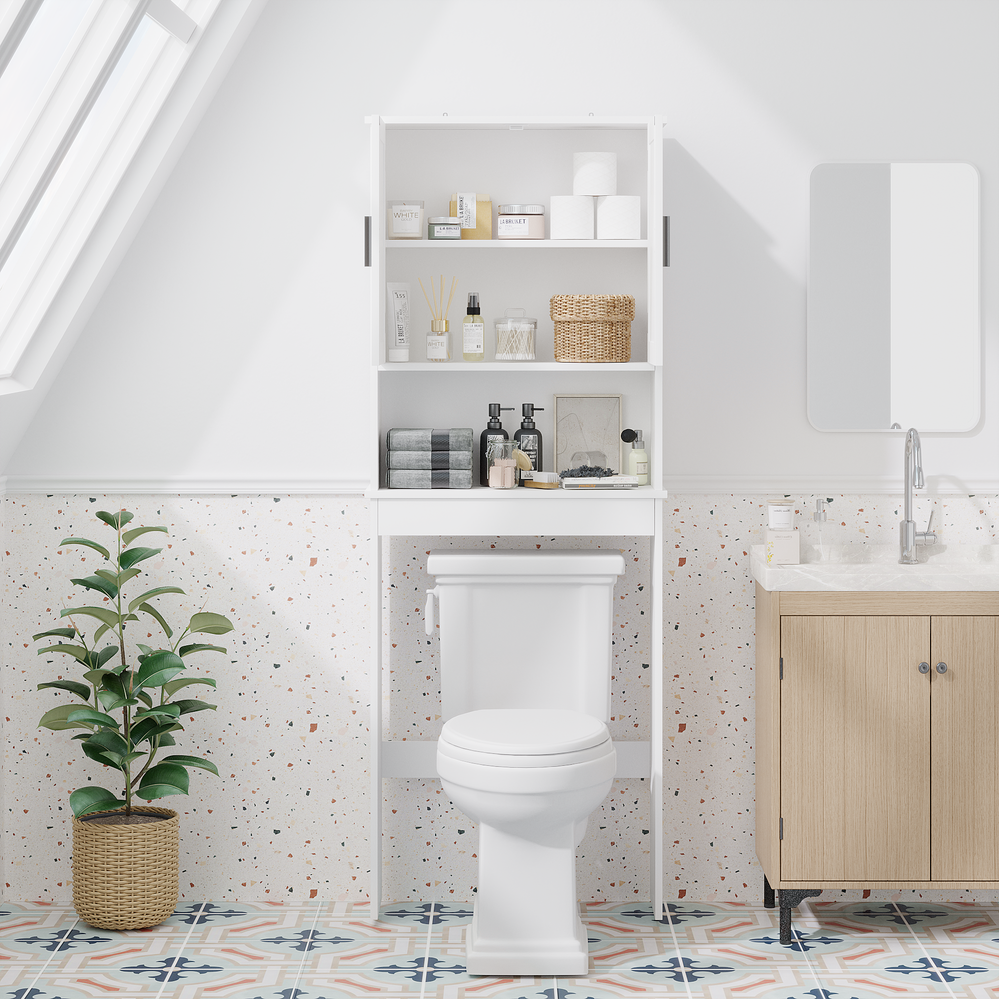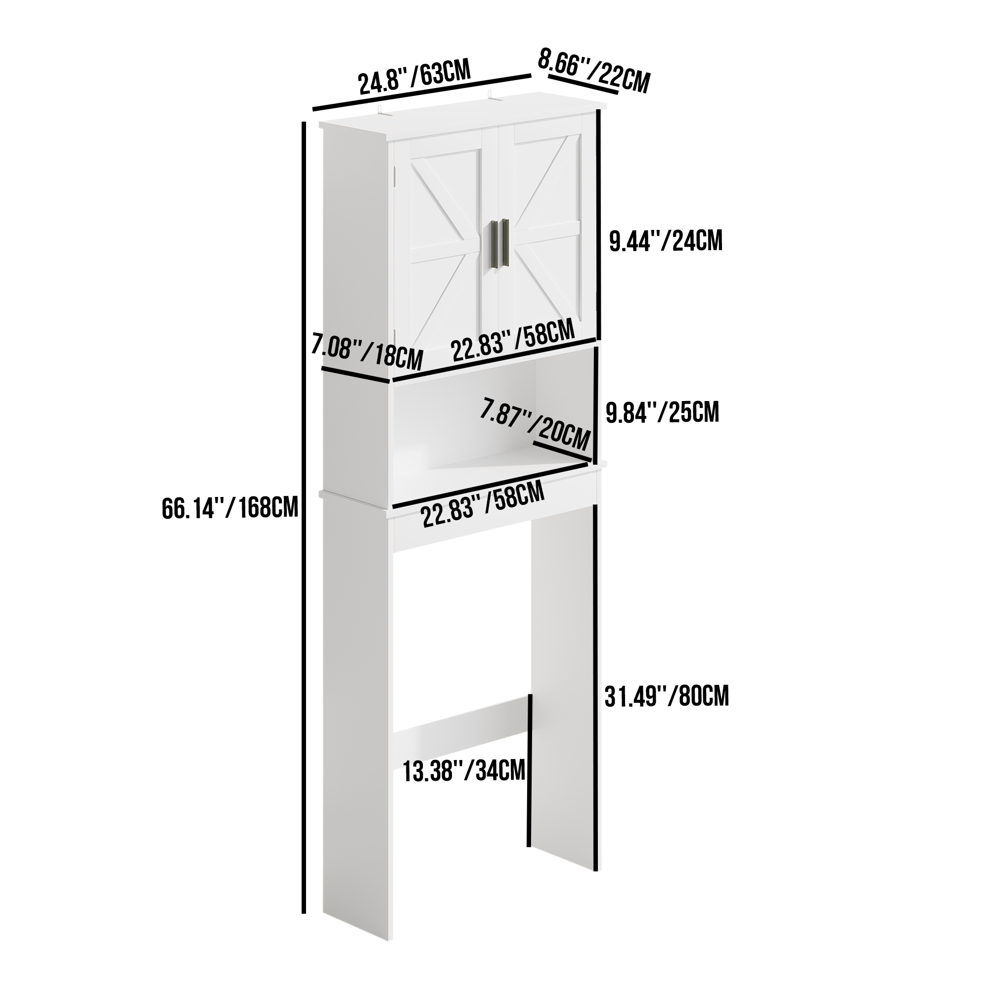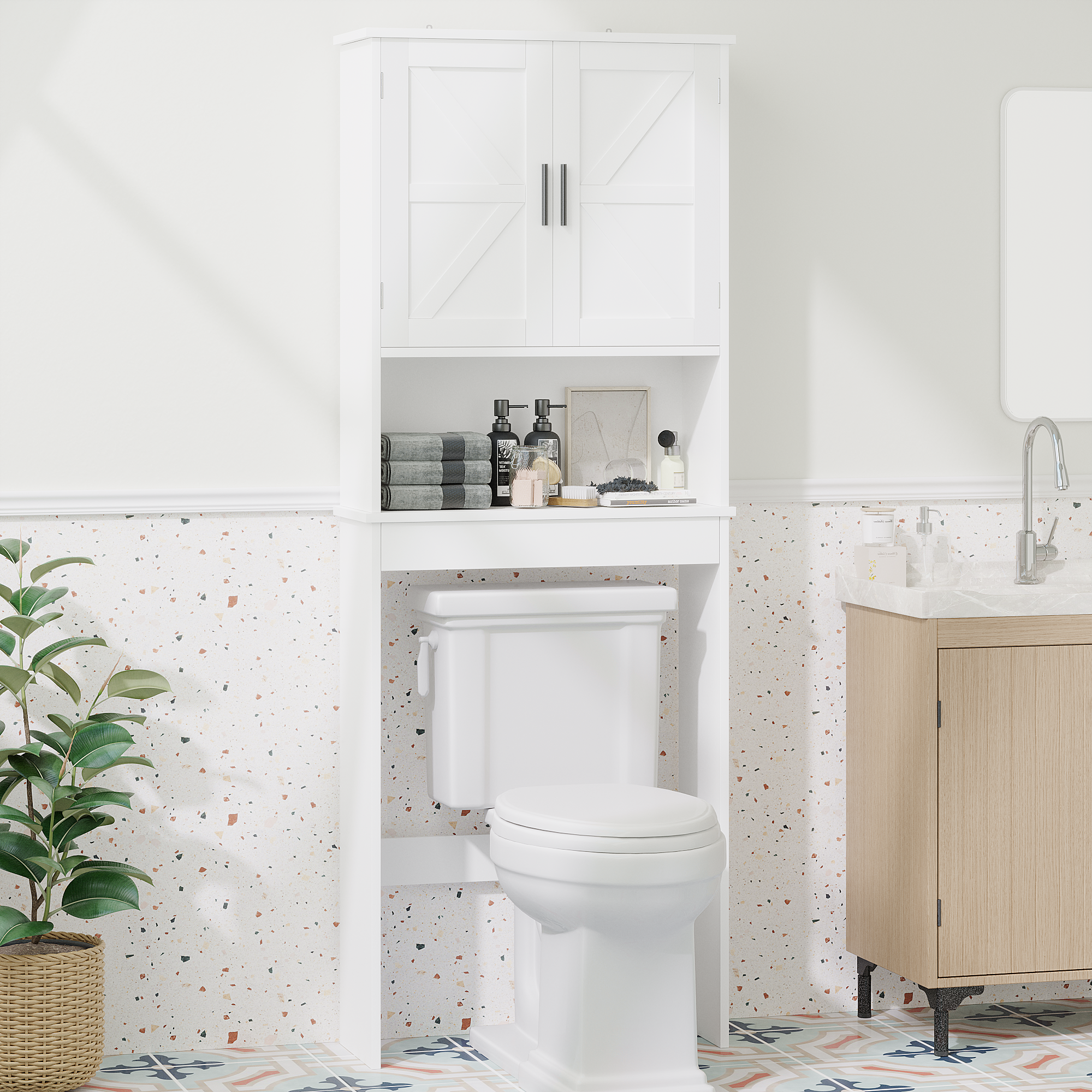 Product Specifications Basic Information Item Code:W808P440630 Product type:Single Box Product Product Name:Over The Toilet Storage Cabinet with Adjustable Shelf, Bathroom Space Saver Organizer with Double Doors and O...