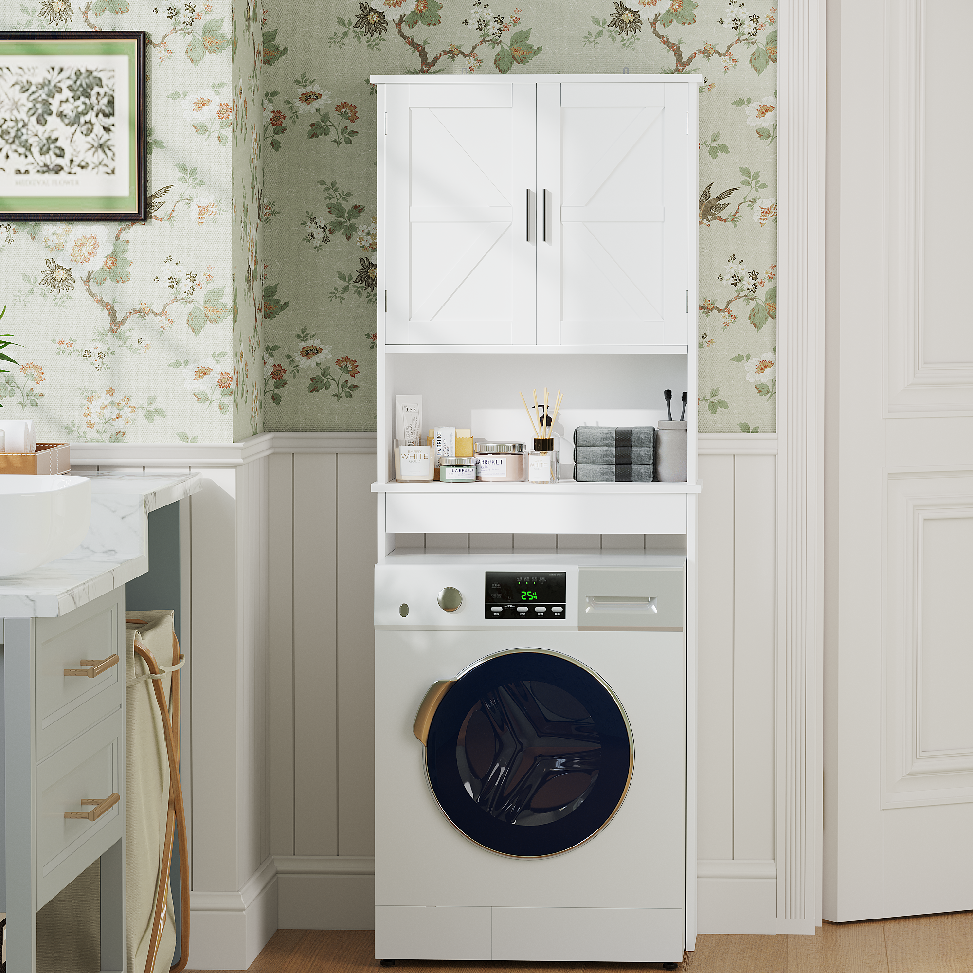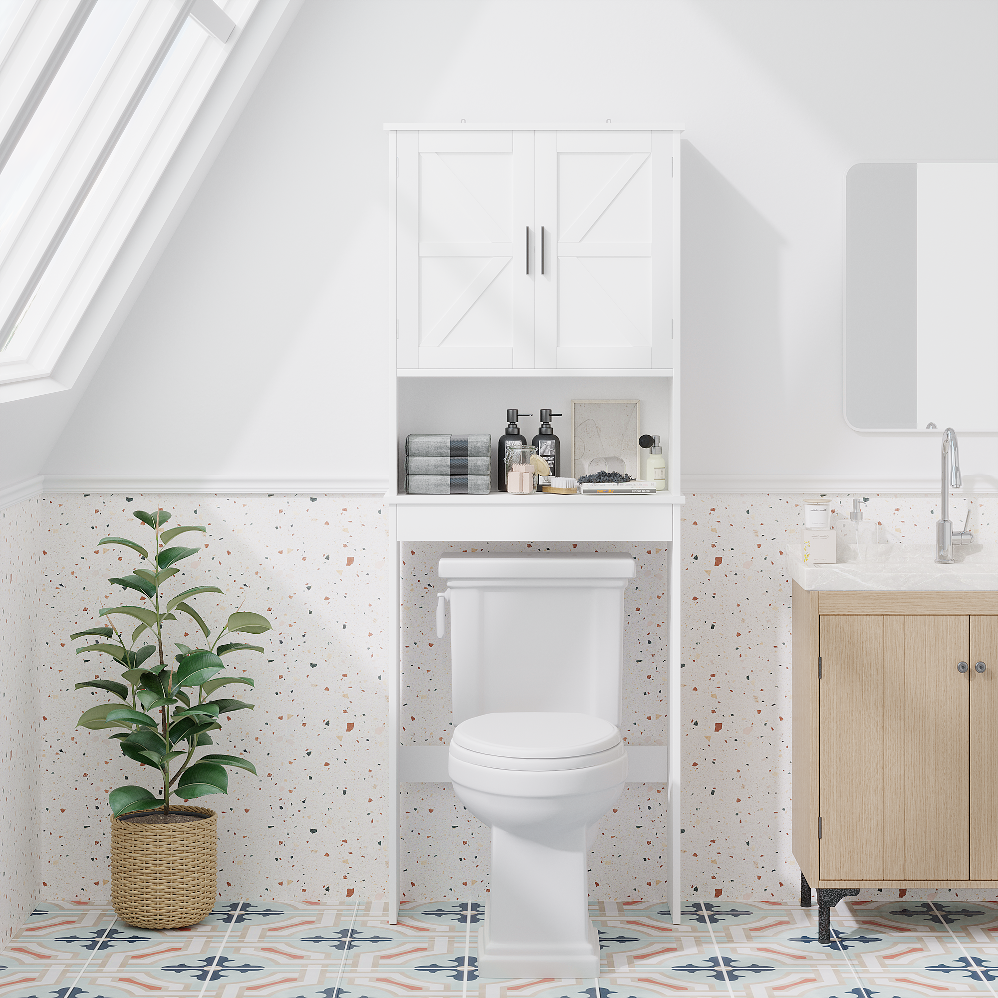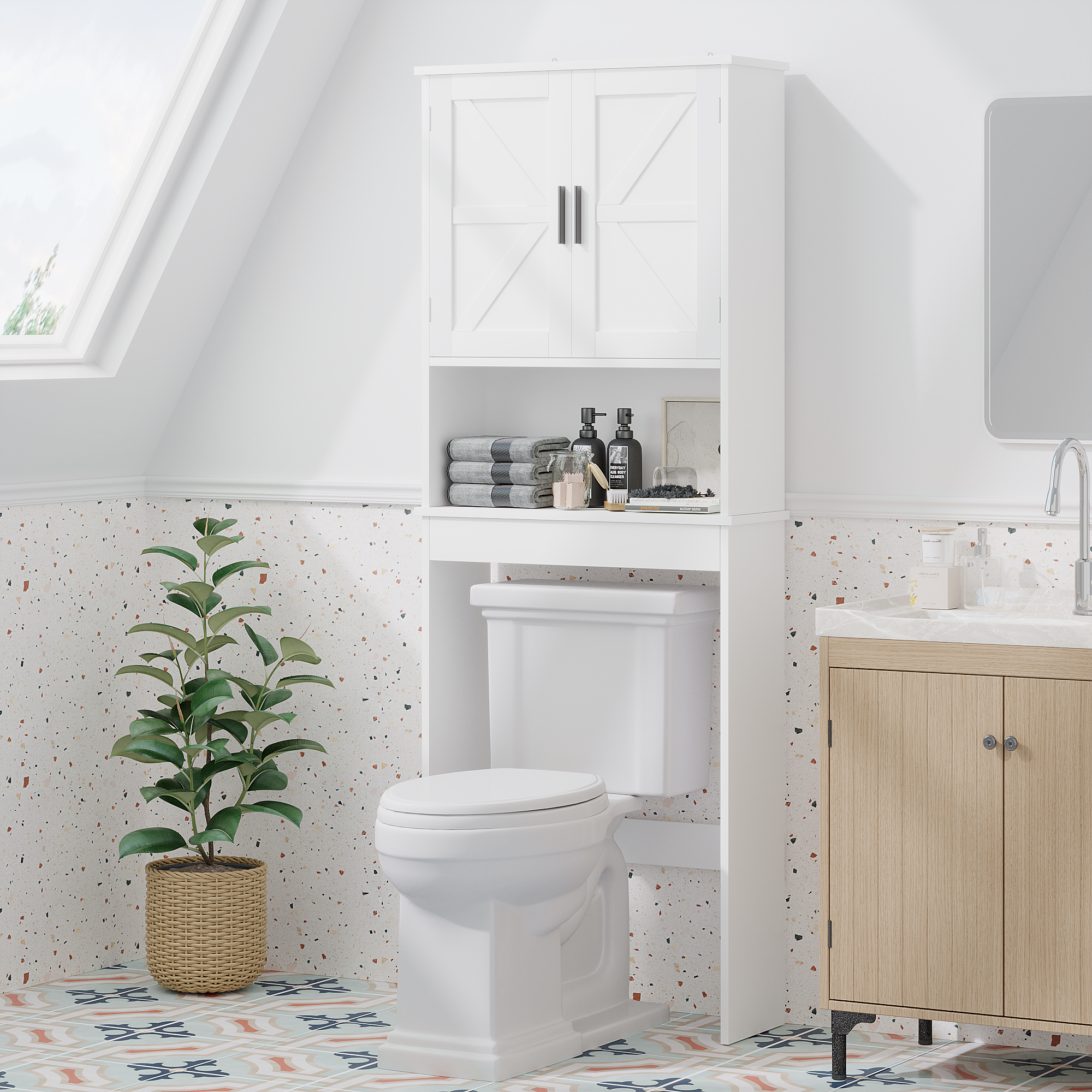 Product Specifications Basic Information Item Code:W808P440630 Product type:Single Box Product Product Name:Over The Toilet Storage Cabinet with Adjustable Shelf, Bathroom Space Saver Organizer with Double Doors and O...