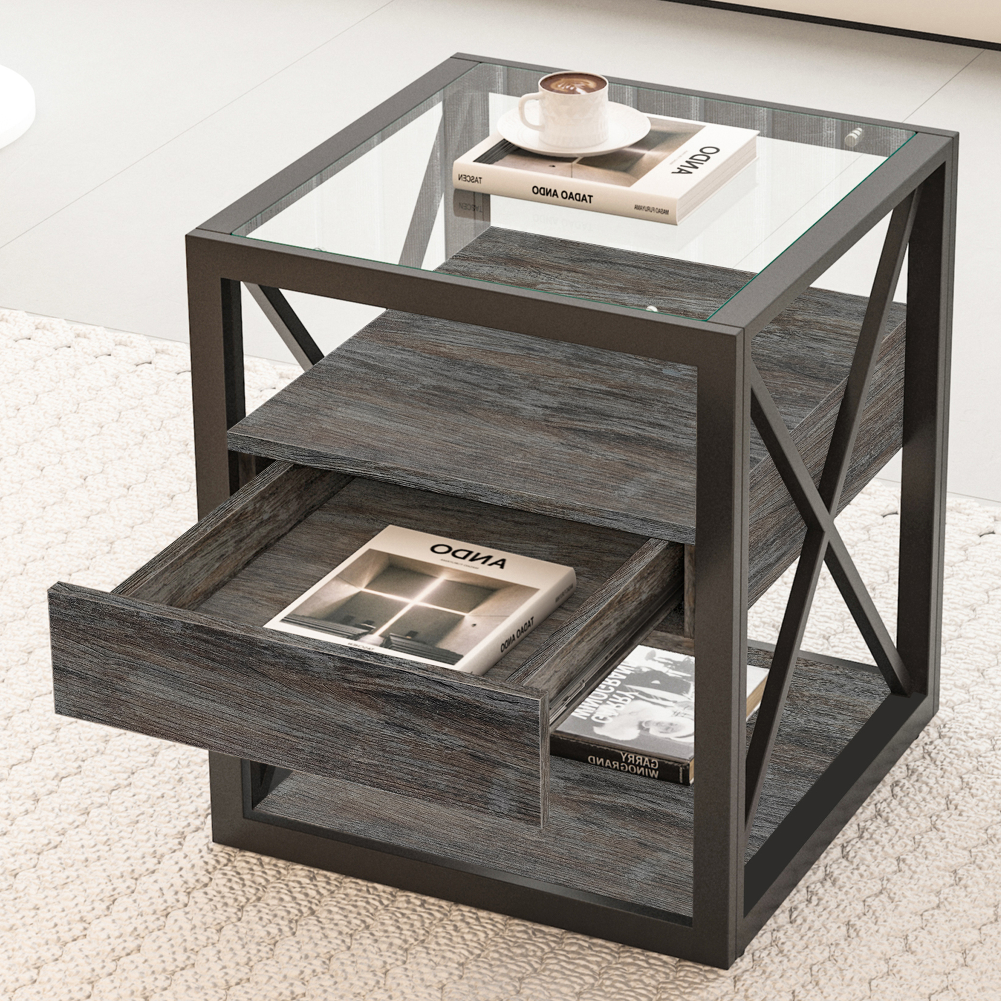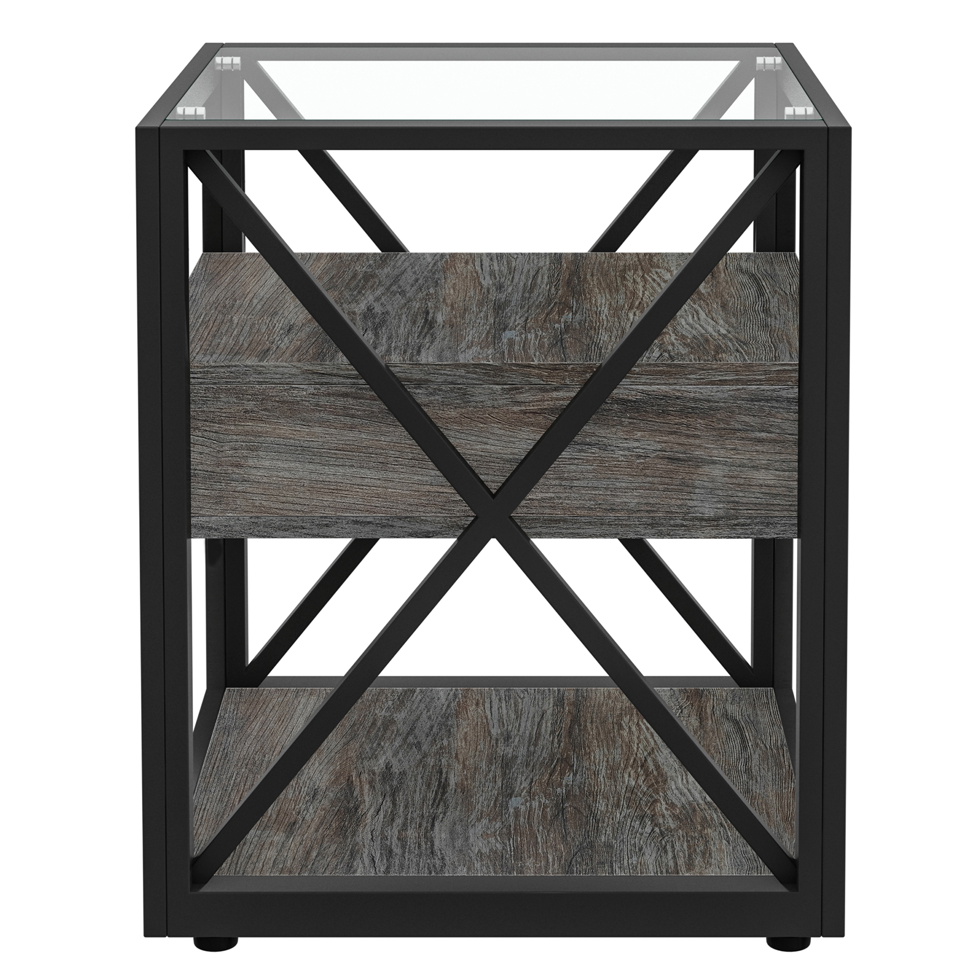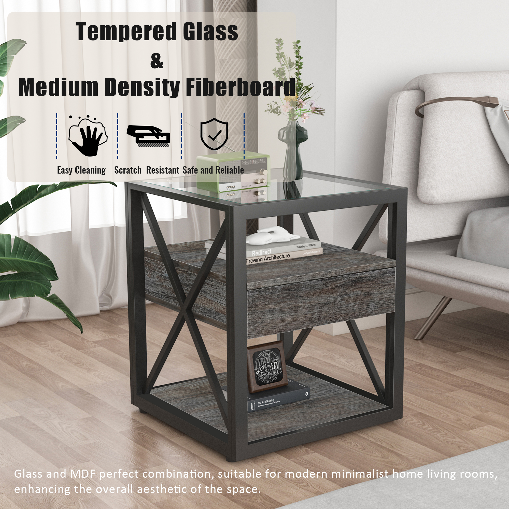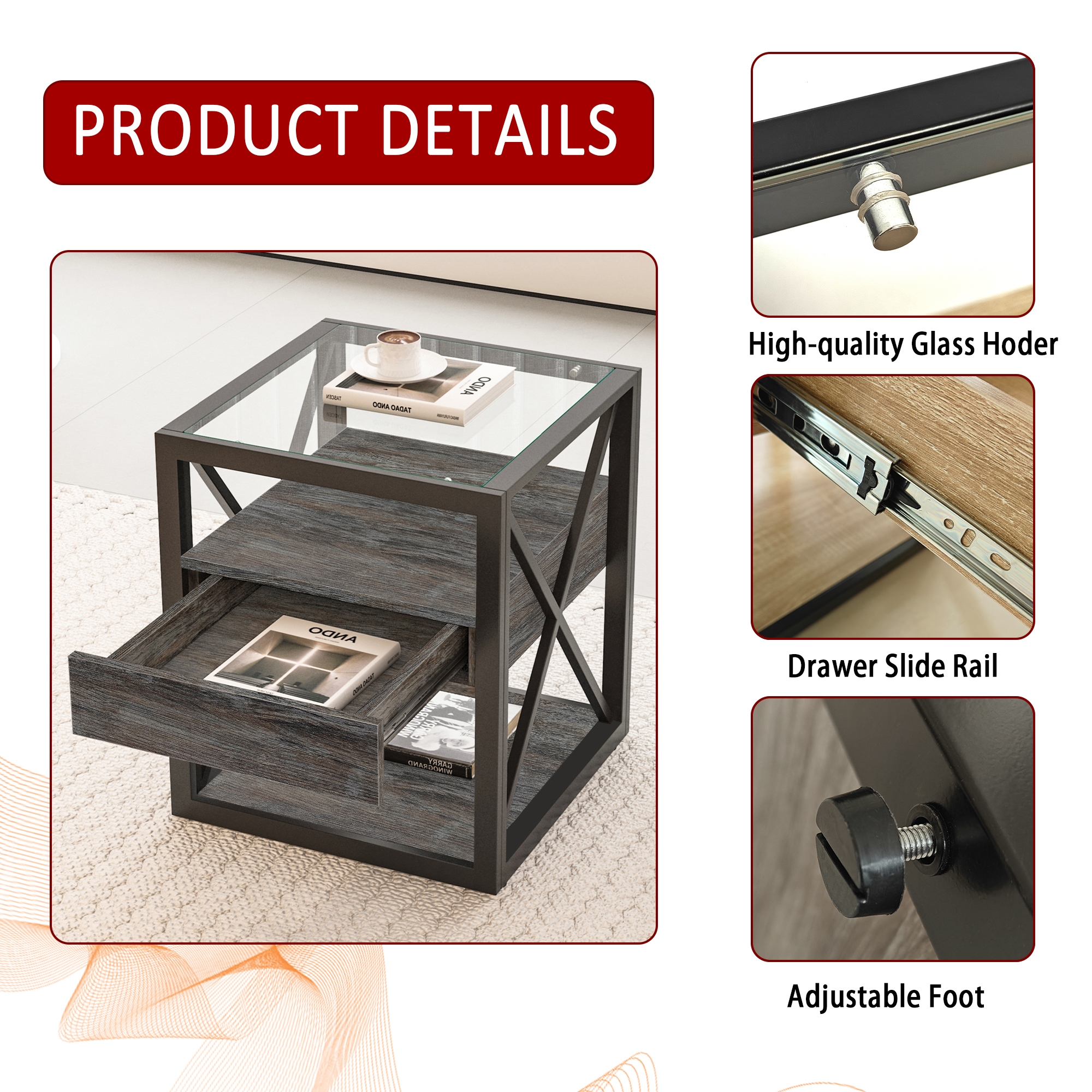 Product Name:Set of 2 Modern End Table with Drawer - Nightstand for Bedroom & Living Room, Rustic Wood Grain MDF & Tempered Glass Top, Industrial Style Side Table