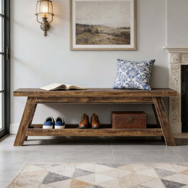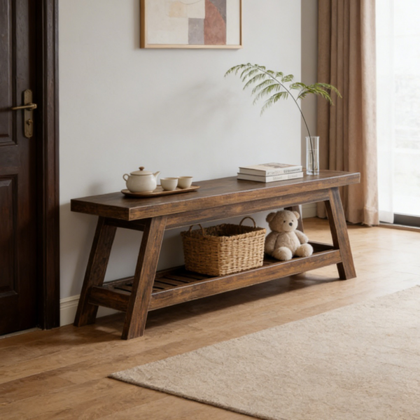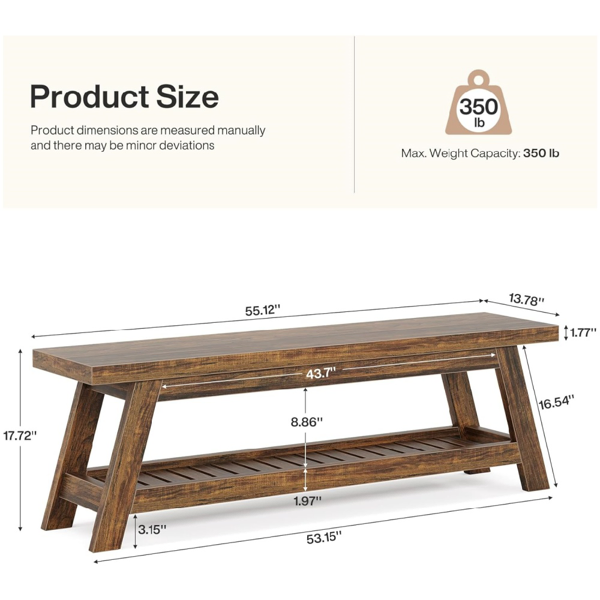 Elegant Wood Tone - Upgrade your entryway with our stylish wooden bench, featuring a warm wood-tone finish. Its timeless design complements any decor, adding both functionality and aesthetic appeal to your space.Ample Storage - Stay organized with the built-in shoe storage shelf. The roomy lower tier holds shoes, sandals, and everyday items, keeping your entry clutter-free and inviting.