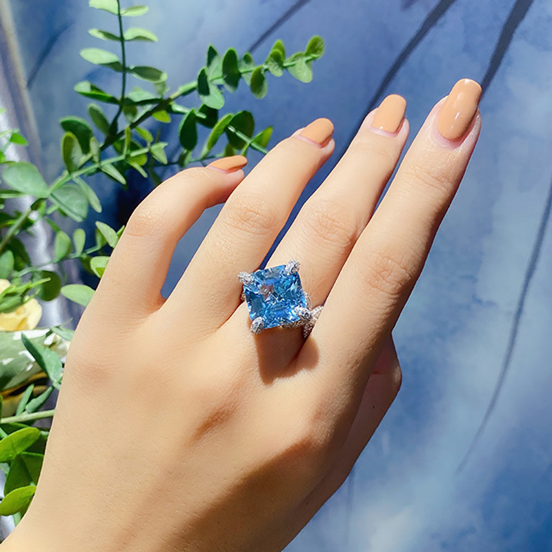 Square Cut Blue Gem Pave Ring, Sparkling Engagement Ring For Her