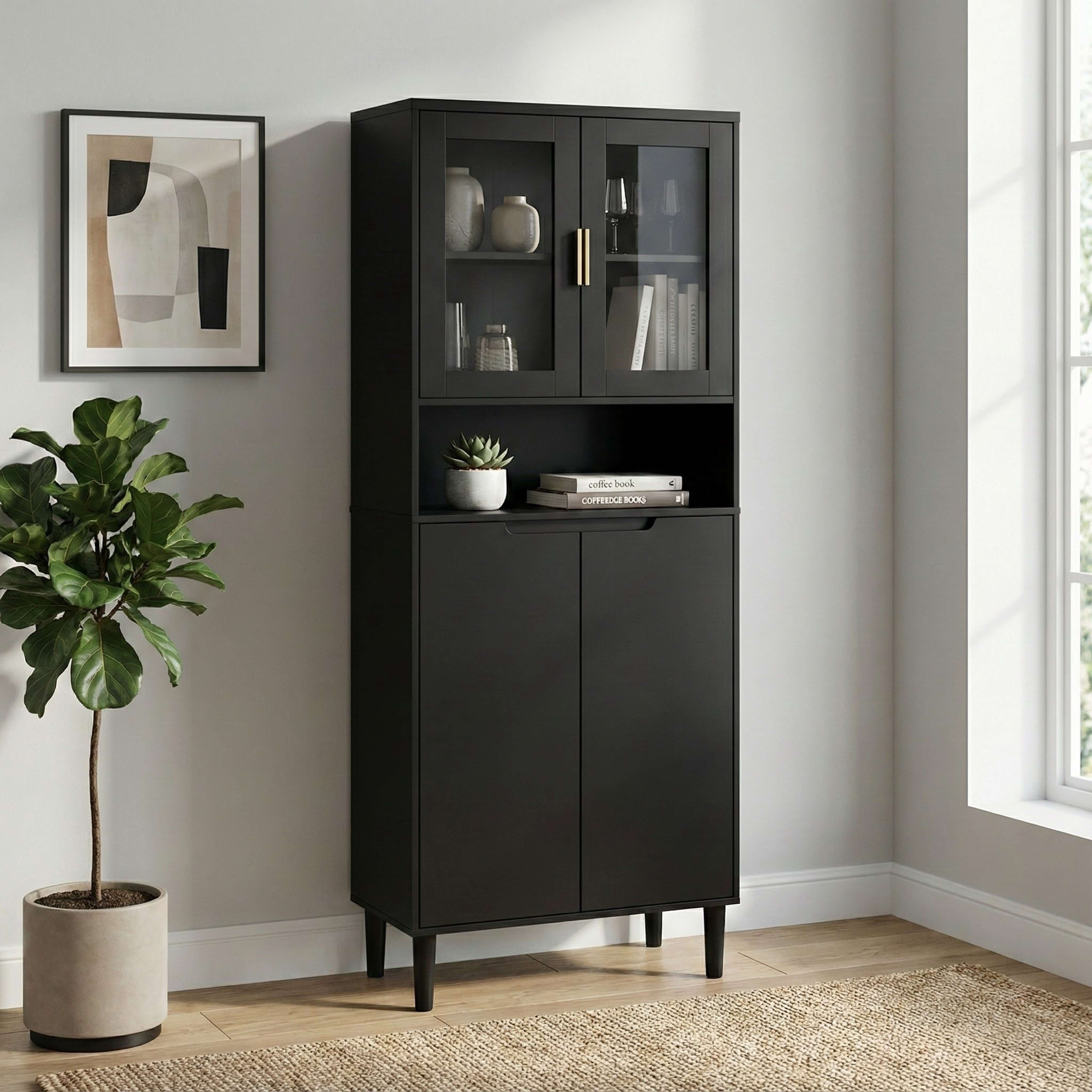 - With its elegant yet chic appearance and classified practical design, this black cabinet is suitable for various places: living room, kitchen pantry, bathroom, office, entryway, or any corner, even as buffet cabinet at dining room. Moreover, the top storage cabinet is equipped with two glass doors, allowing it to be used as a filing cabinet, display cabinet, or bookcase in a home office.