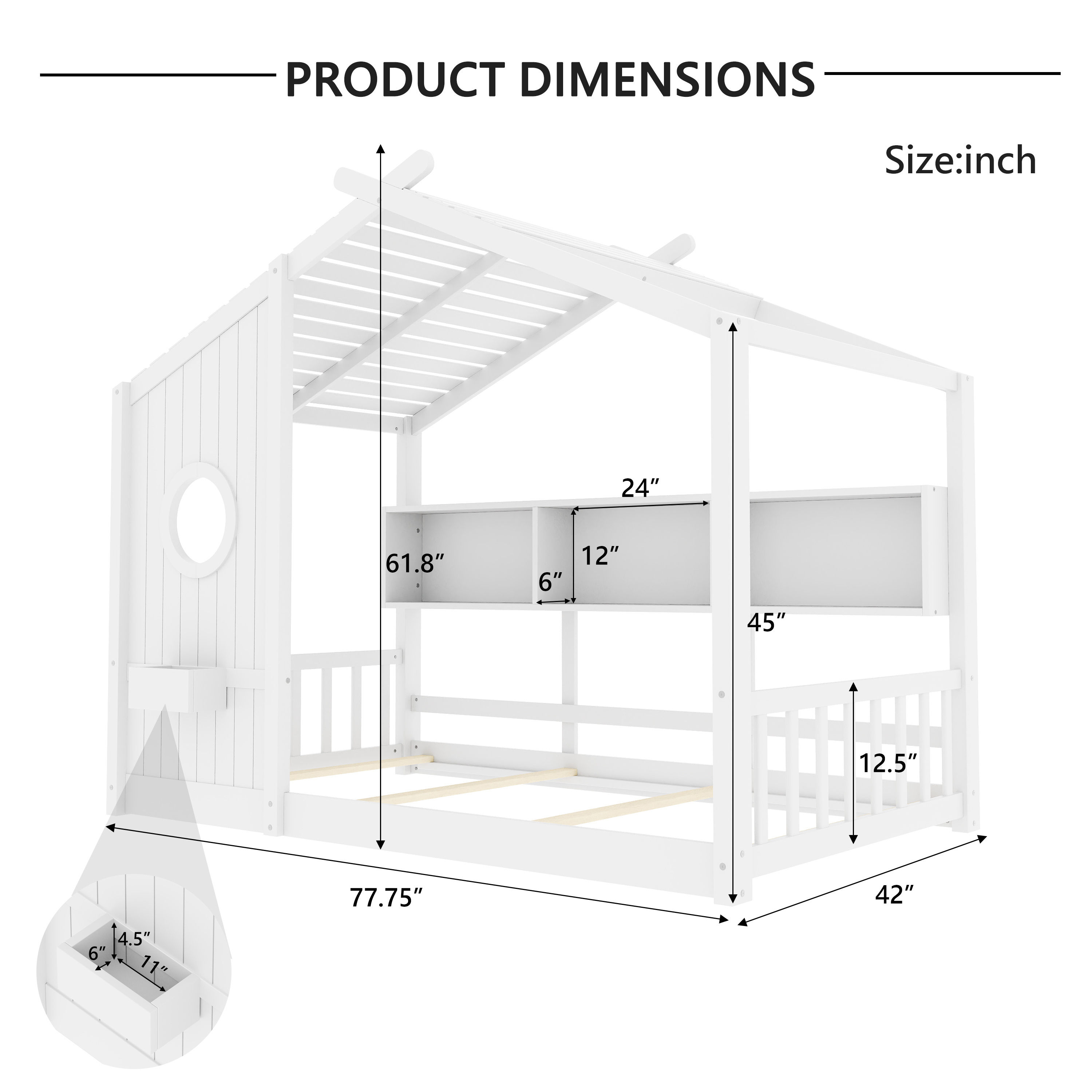Product Specifications: Basic information Product Type:Single Box Product Product Name:Twin Size Floor House Bed for Toddler, Kids Montessori Bed with Storage Shelf, Playhouse Bed with Roof Design, White Color:White M...