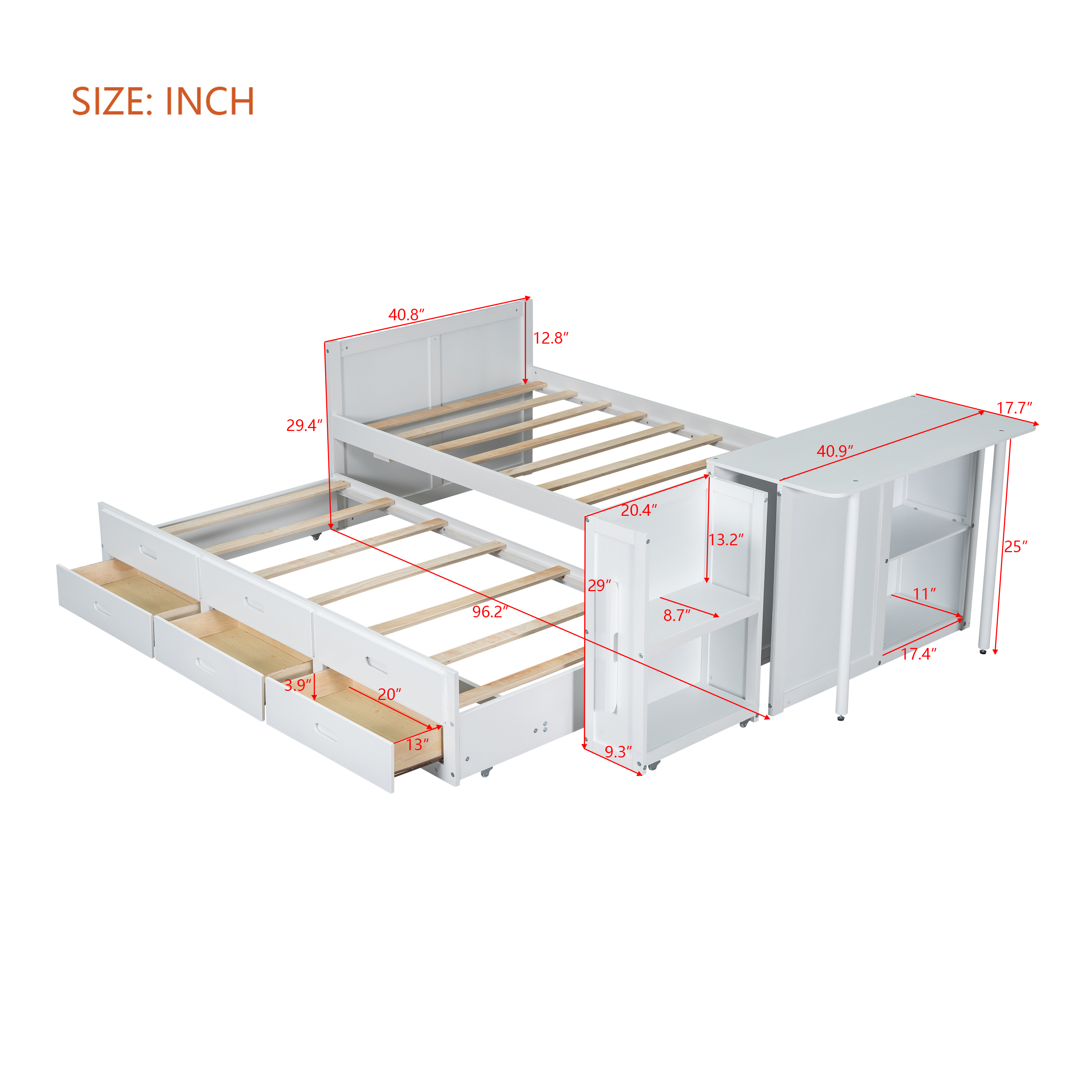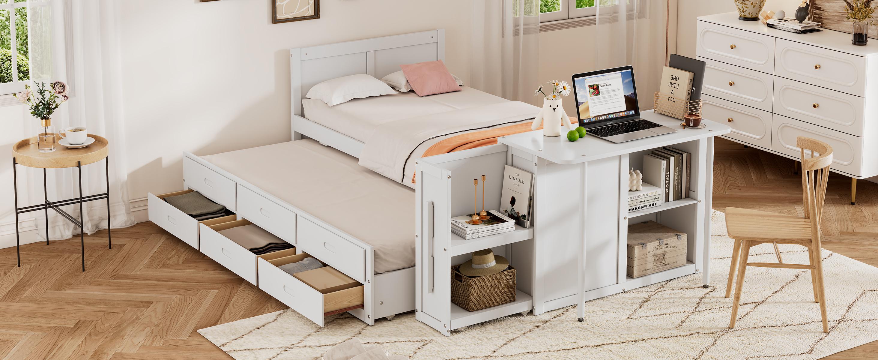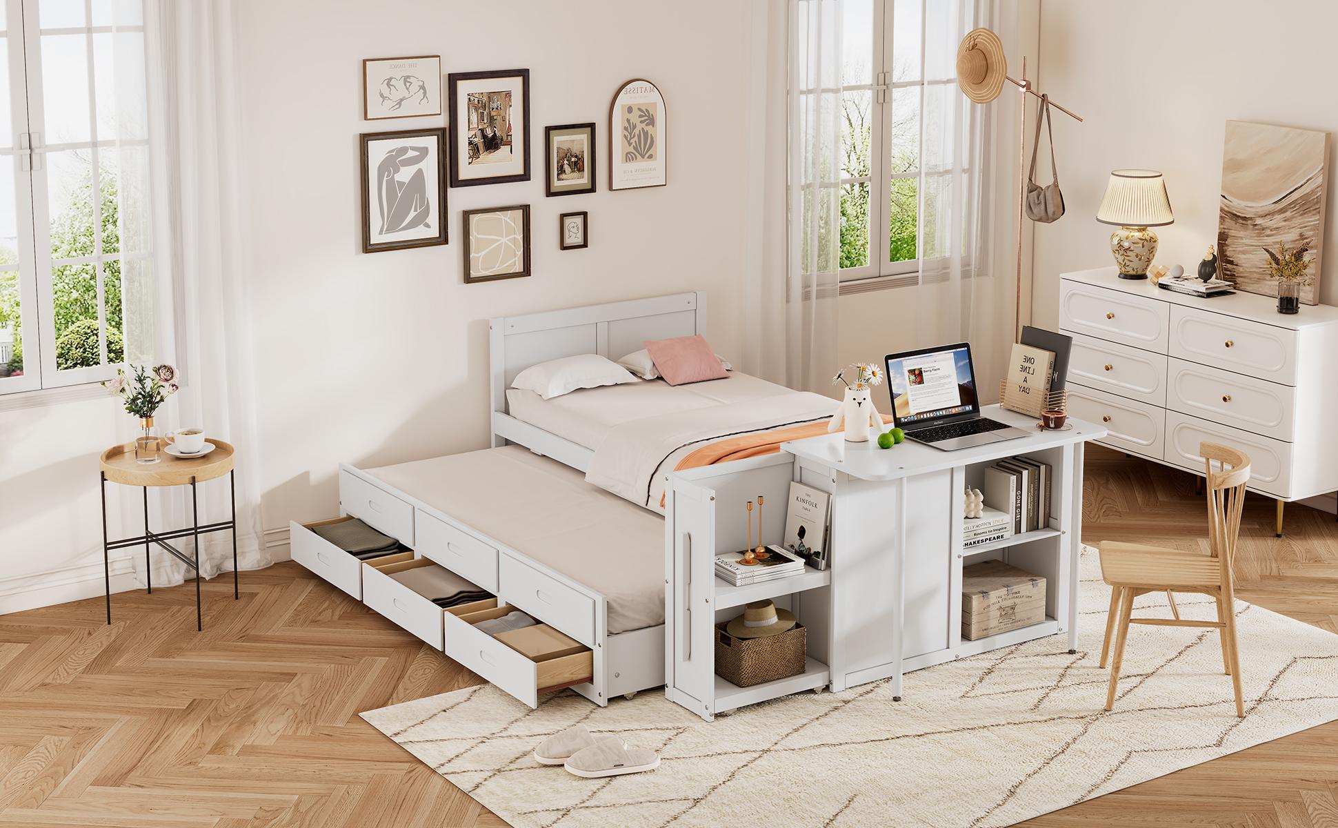Product Specifications: Basic information Product Type:Combo Item Product Name:Twin Size Multifunctional Wood Platform Bed with Desk and Storage Shelf at the End of the Bed, Built-in Trundle and 3 Drawers, White Color...