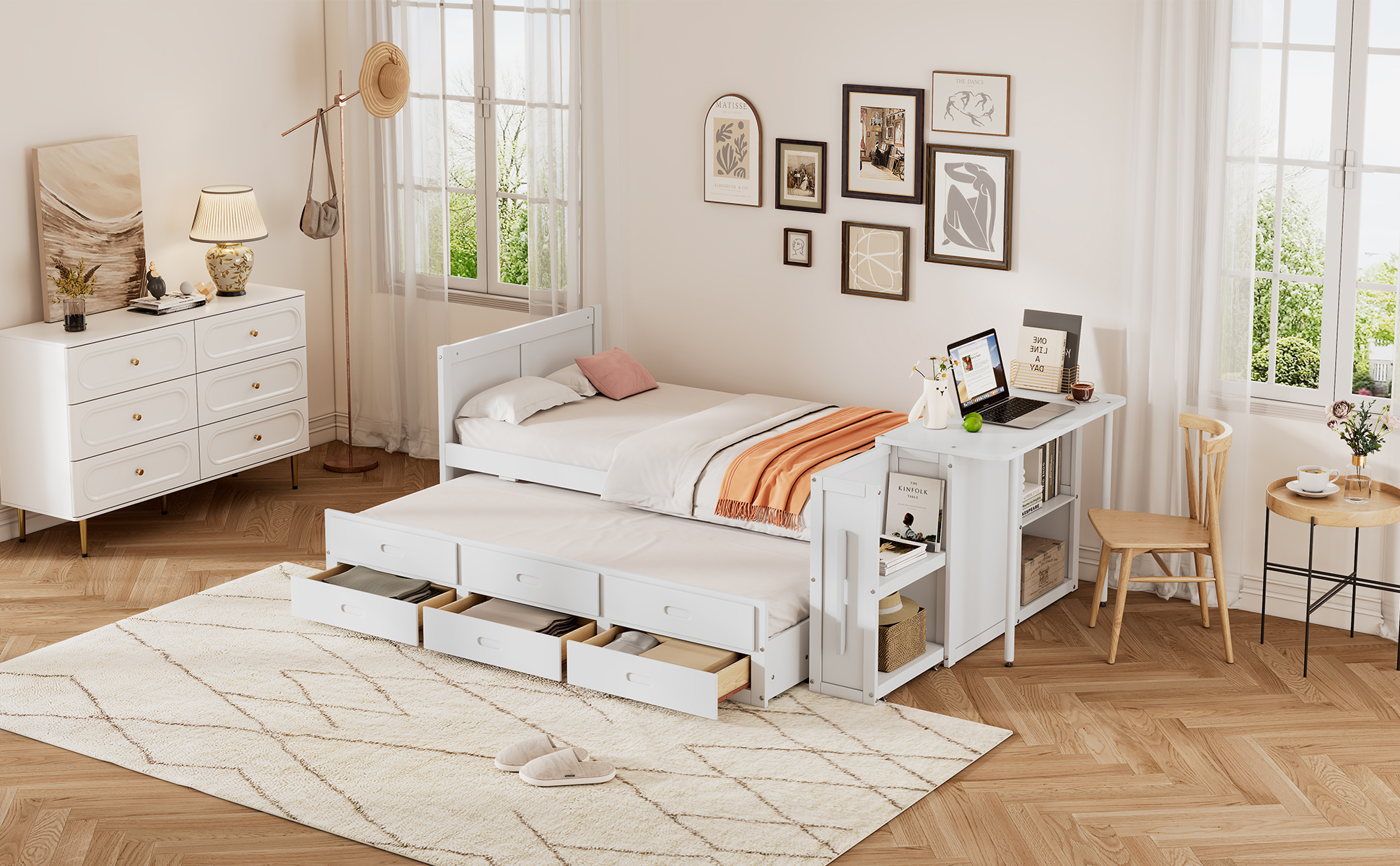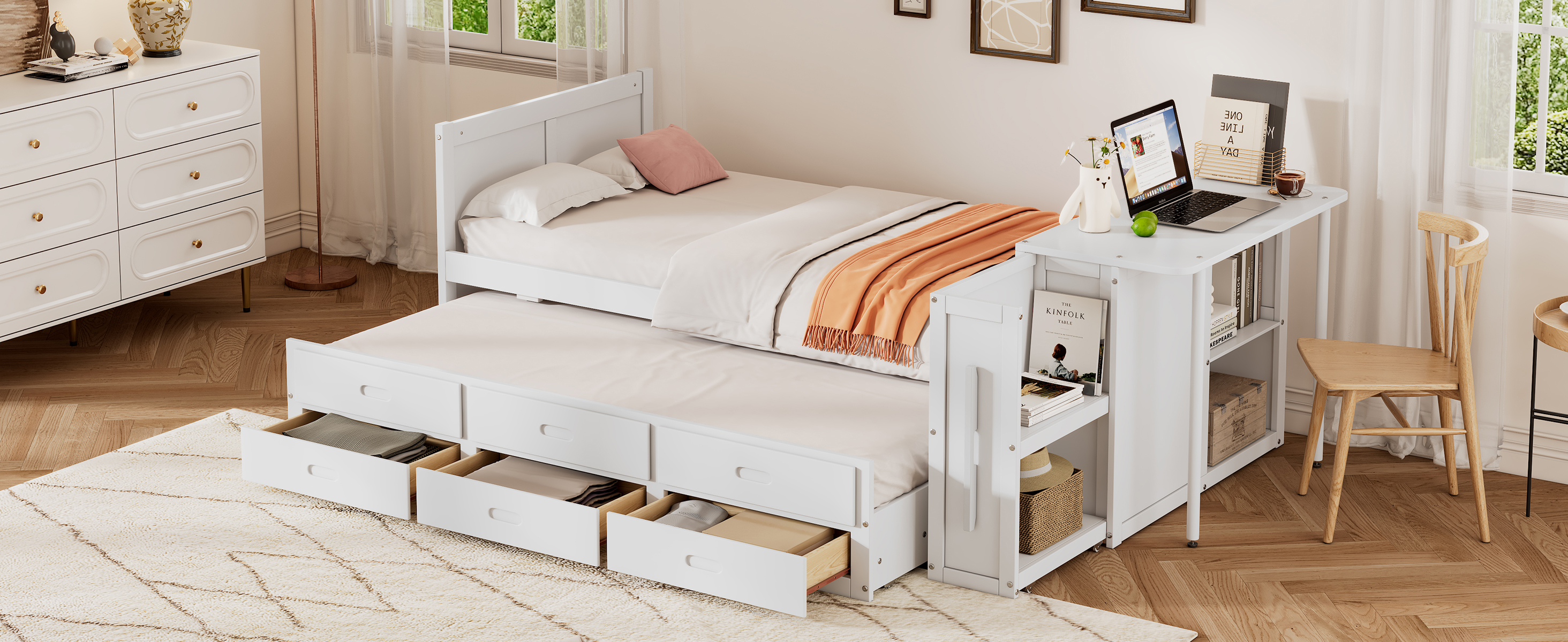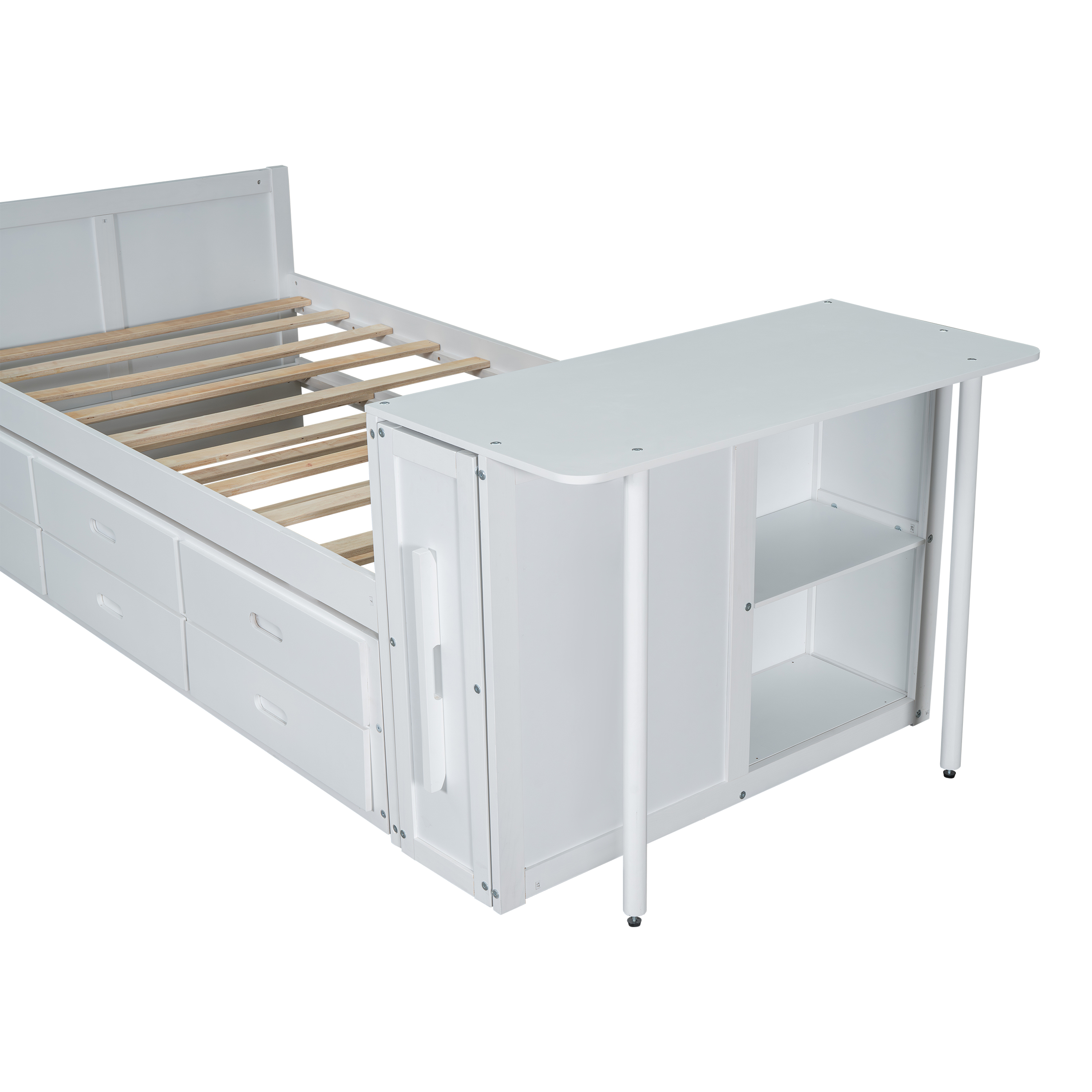 Product Specifications: Basic information Product Type:Combo Item Product Name:Twin Size Multifunctional Wood Platform Bed with Desk and Storage Shelf at the End of the Bed, Built-in Trundle and 3 Drawers, White Color...
