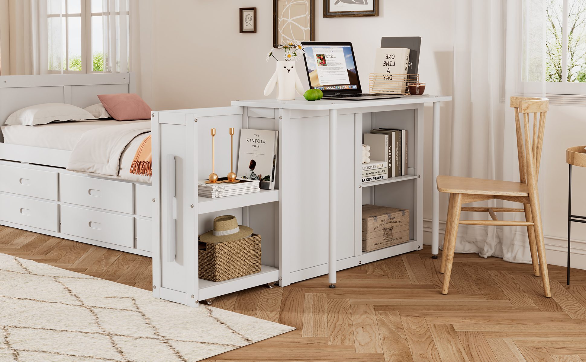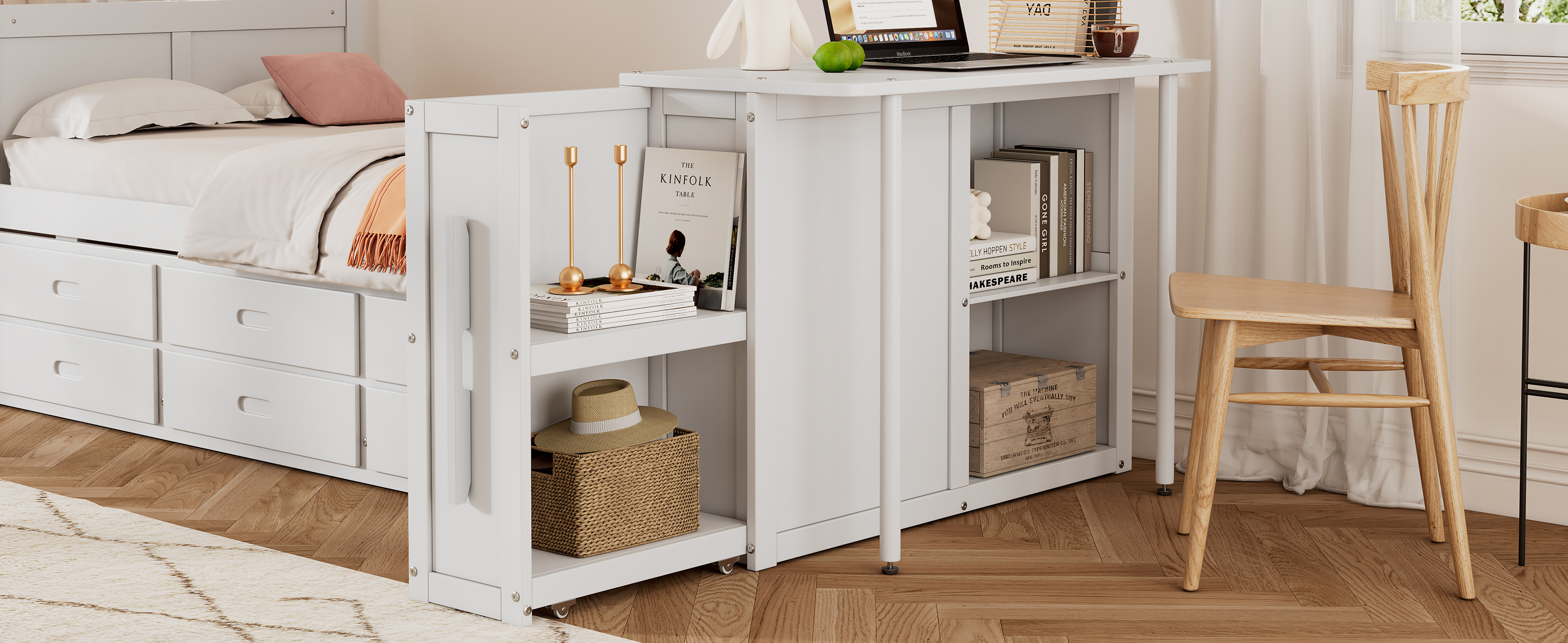 - Space-Saving Design: This twin-size bed integrates a built-in desk, trundle, and storage shelf at the foot of the bed, making it perfect for compact bedrooms or multifunctional spaces.