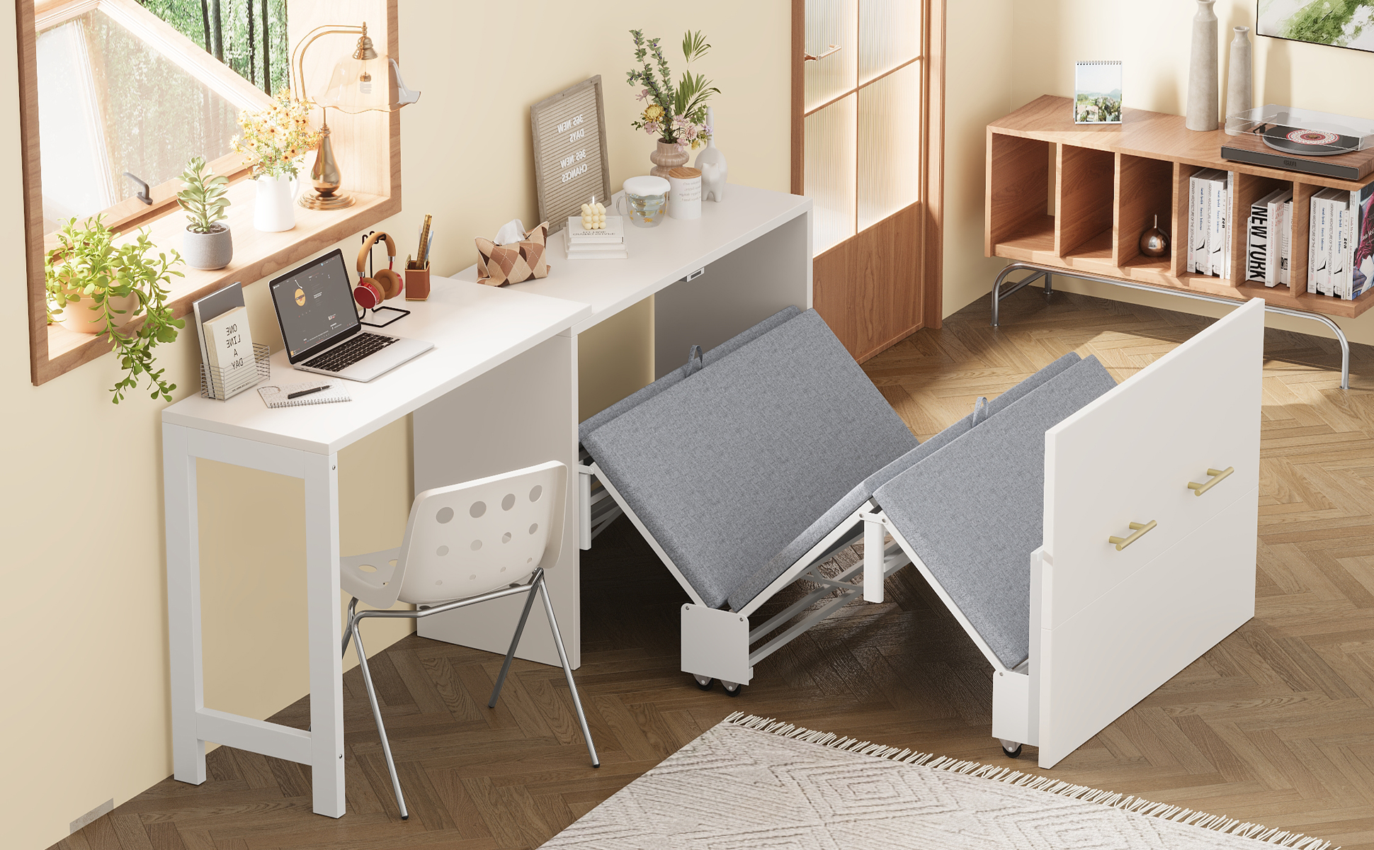 - 2. Murphy Bed with Desk:The desk that comes with this Murphy bed is fully adjustable and can be positioned in multiple ways to suit your space. Whether placed in a straight line with the dresser or arranged in an L-shape, it offers flexible layout options to accommodate compact rooms of various shapes and sizes. A perfect fit for maximizing functionality in small apartments, studios, or guest rooms.