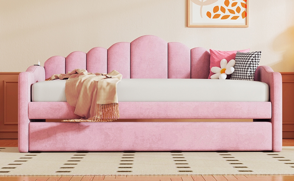 Product Specifications: Basic information Product Type:Combo Item Product Name:Twin size Upholstered Daybed with Trundle ,Velvet Sofabed with USB Charging Ports,No Box-spring Needed,Pink Color:Pink Material:Velvet Bed...