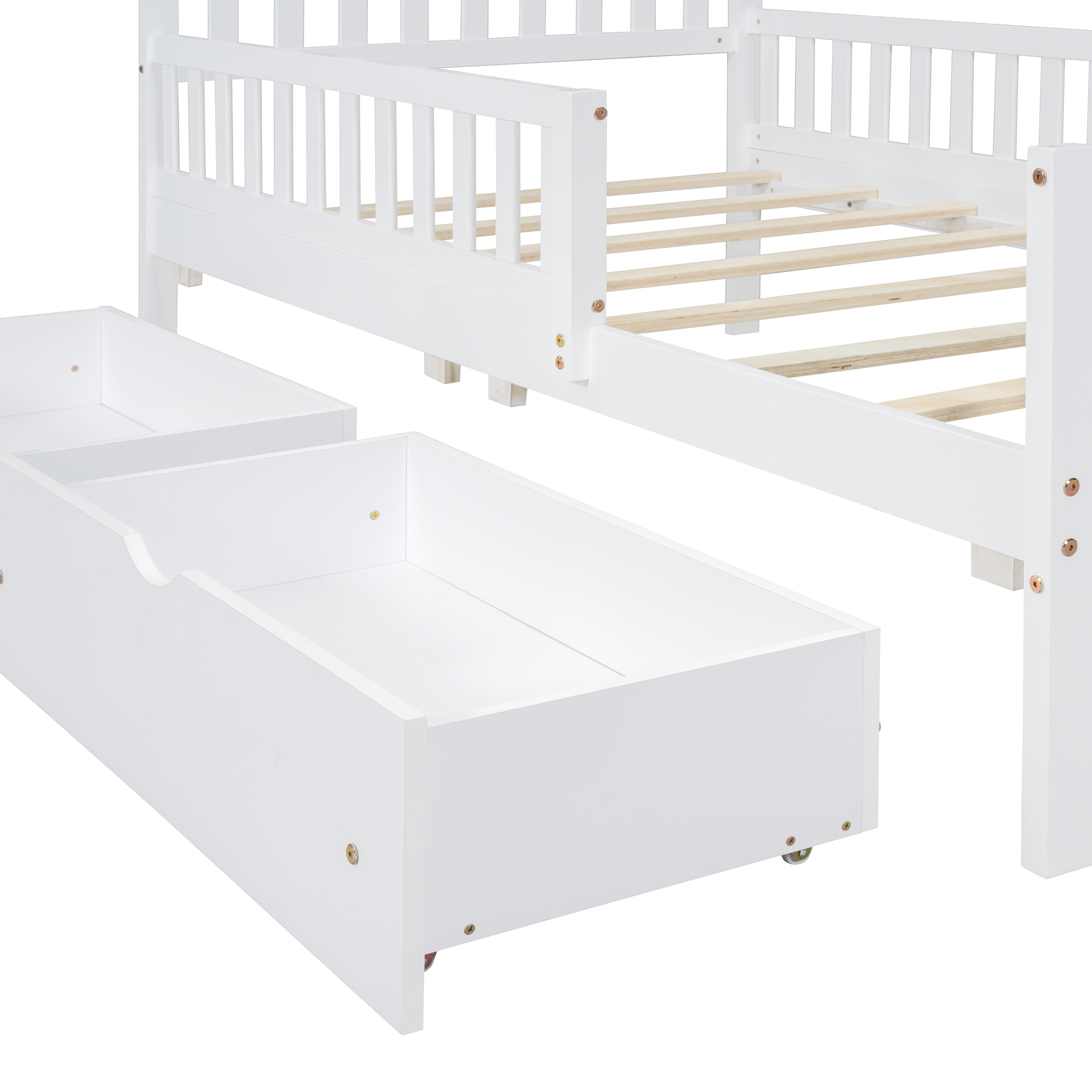Product Specifications: Basic information Product Type:Single Box Product Product Name:Twin Size Wood Platform Bed with Guardrails on Both Sides and Two Storage Drawers ,White Color:White Material:Wood Bed Dimensions:...