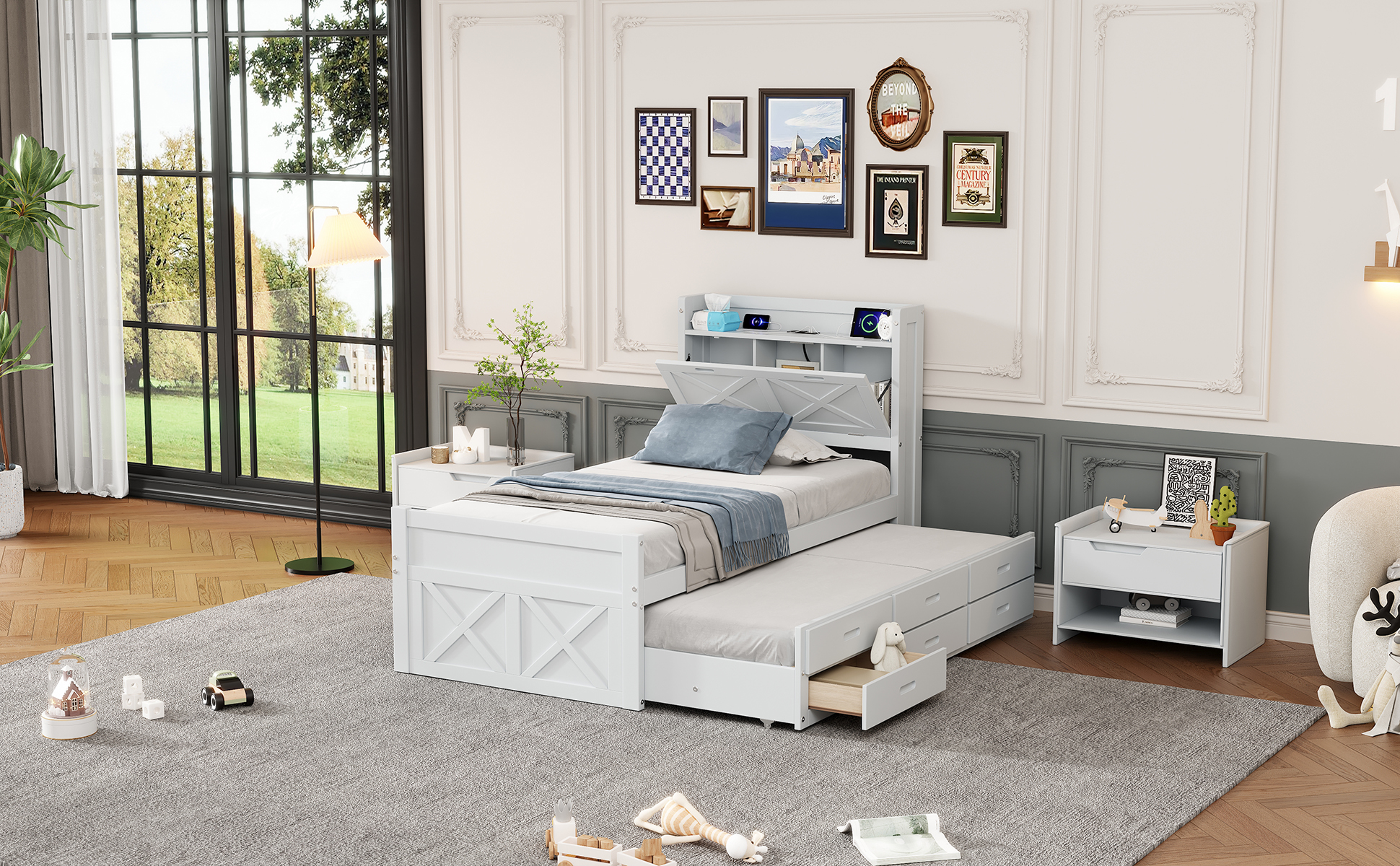 - Space-saving:The bed includes one trundle, which can be rolled out to provide extra sleeping space to put another twin size mattresses. This design is ideal for families with children or users who need to host guests frequently.