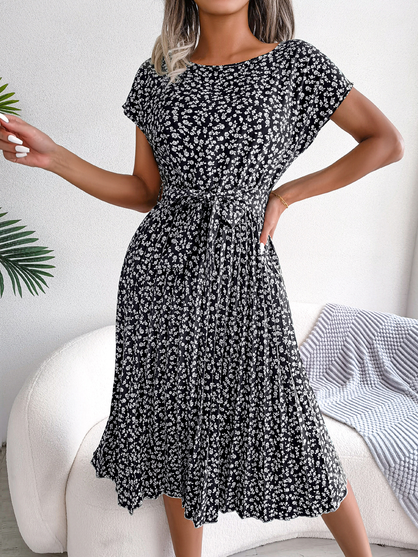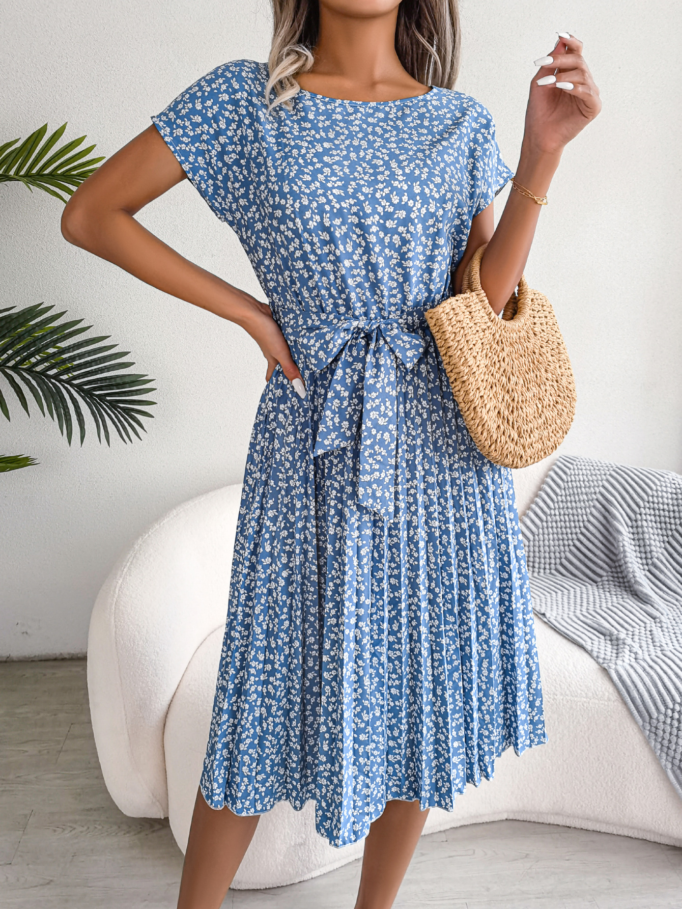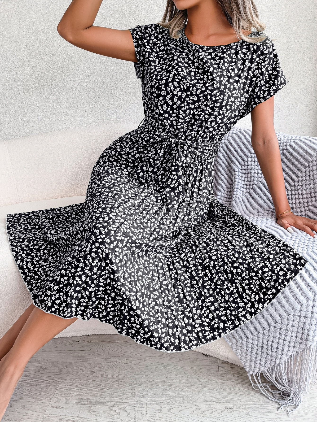 Women Casual Short Sleeve Floral Print Flowy Pleated Skirt