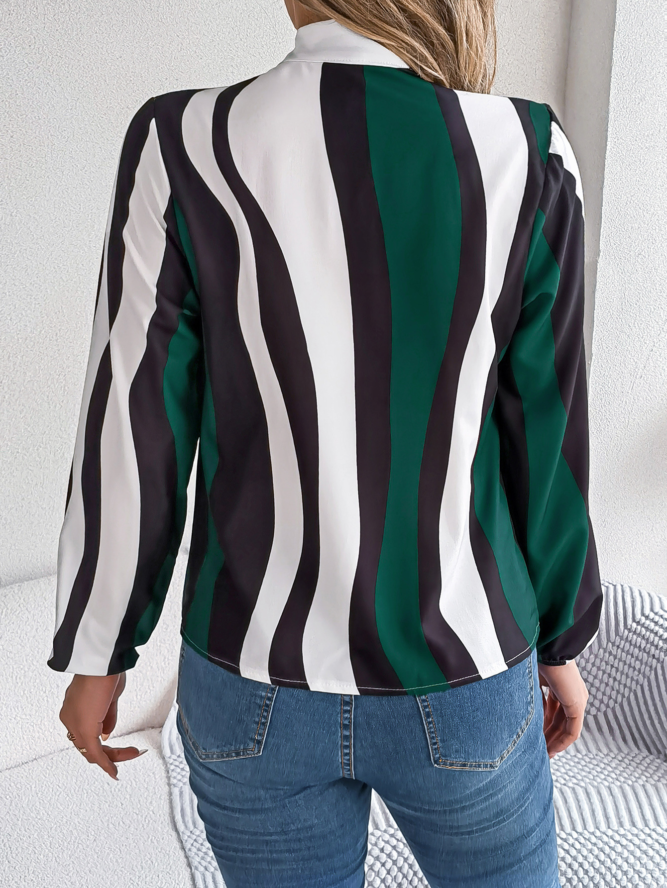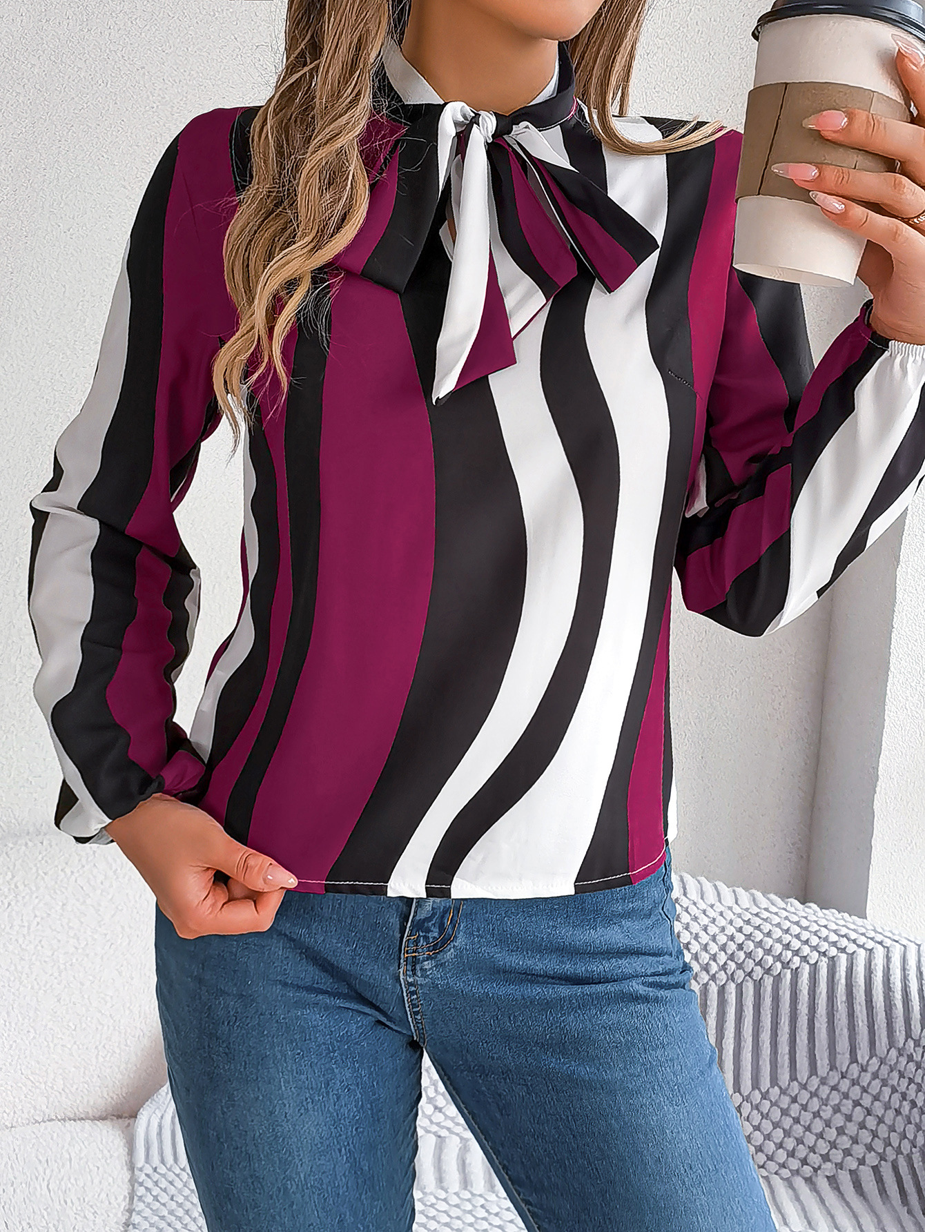 Women's Elegant Color Block Stripe Tie Waist Lantern Sleeve Chiffon Top