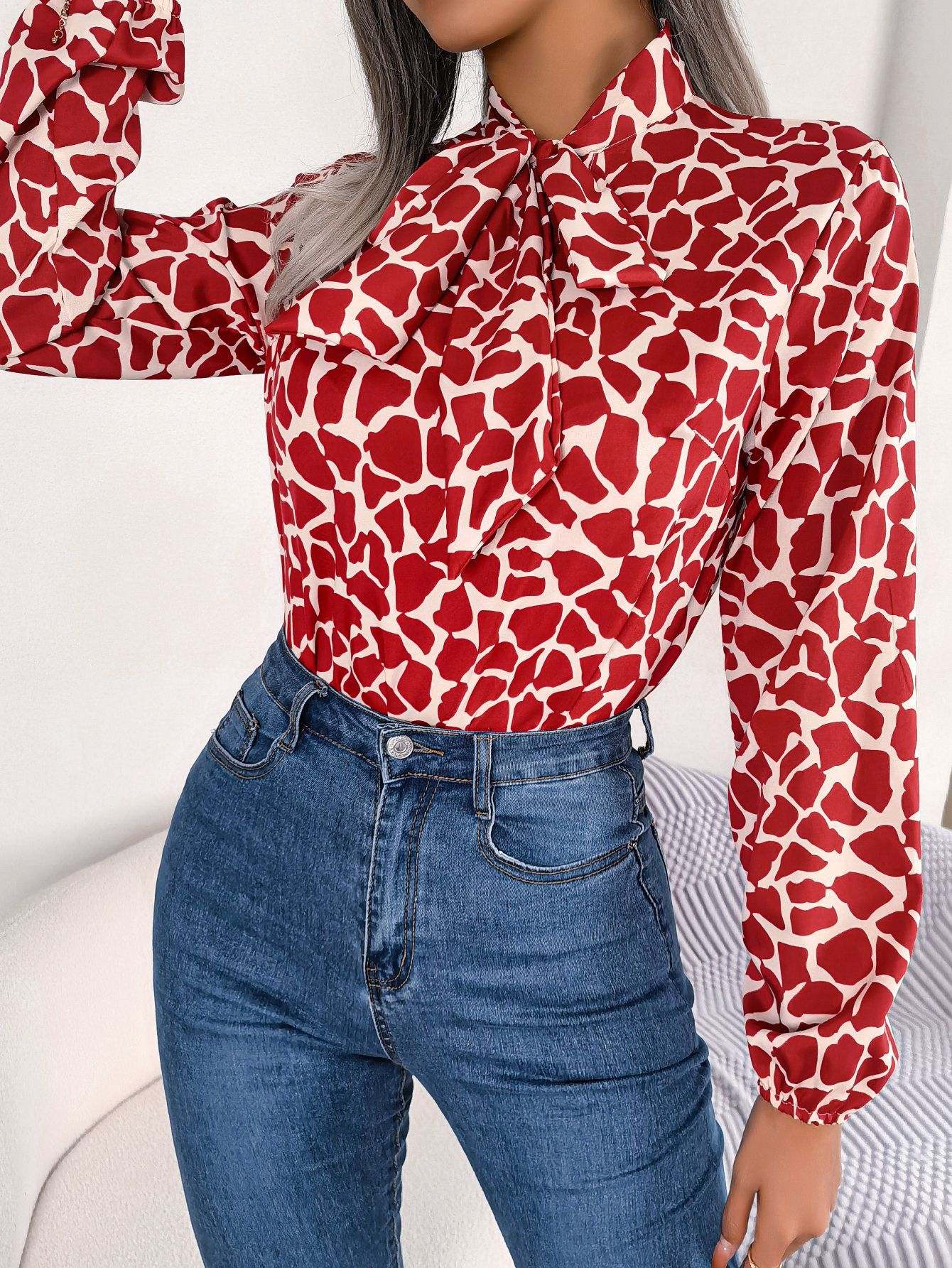 Women's Elegant Color Block Tie Waist Lantern Sleeve Chiffon Top