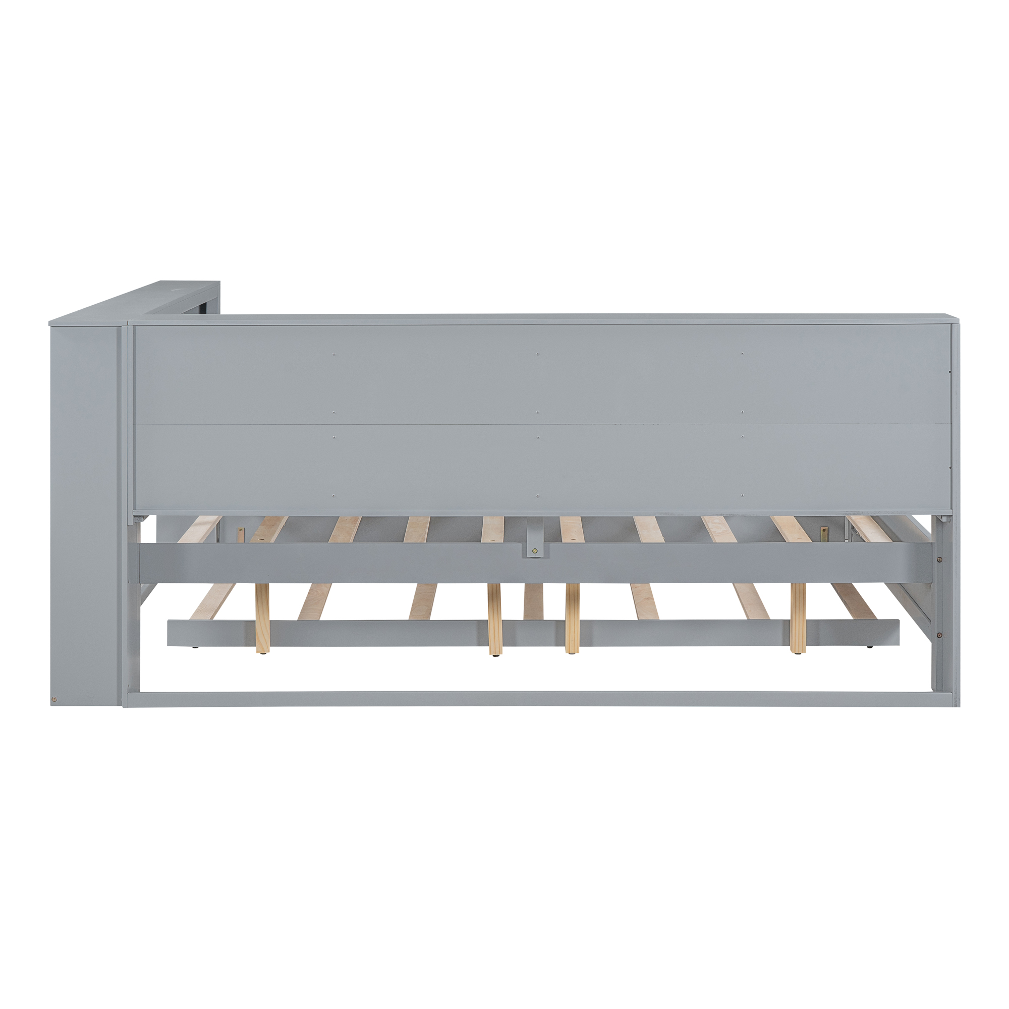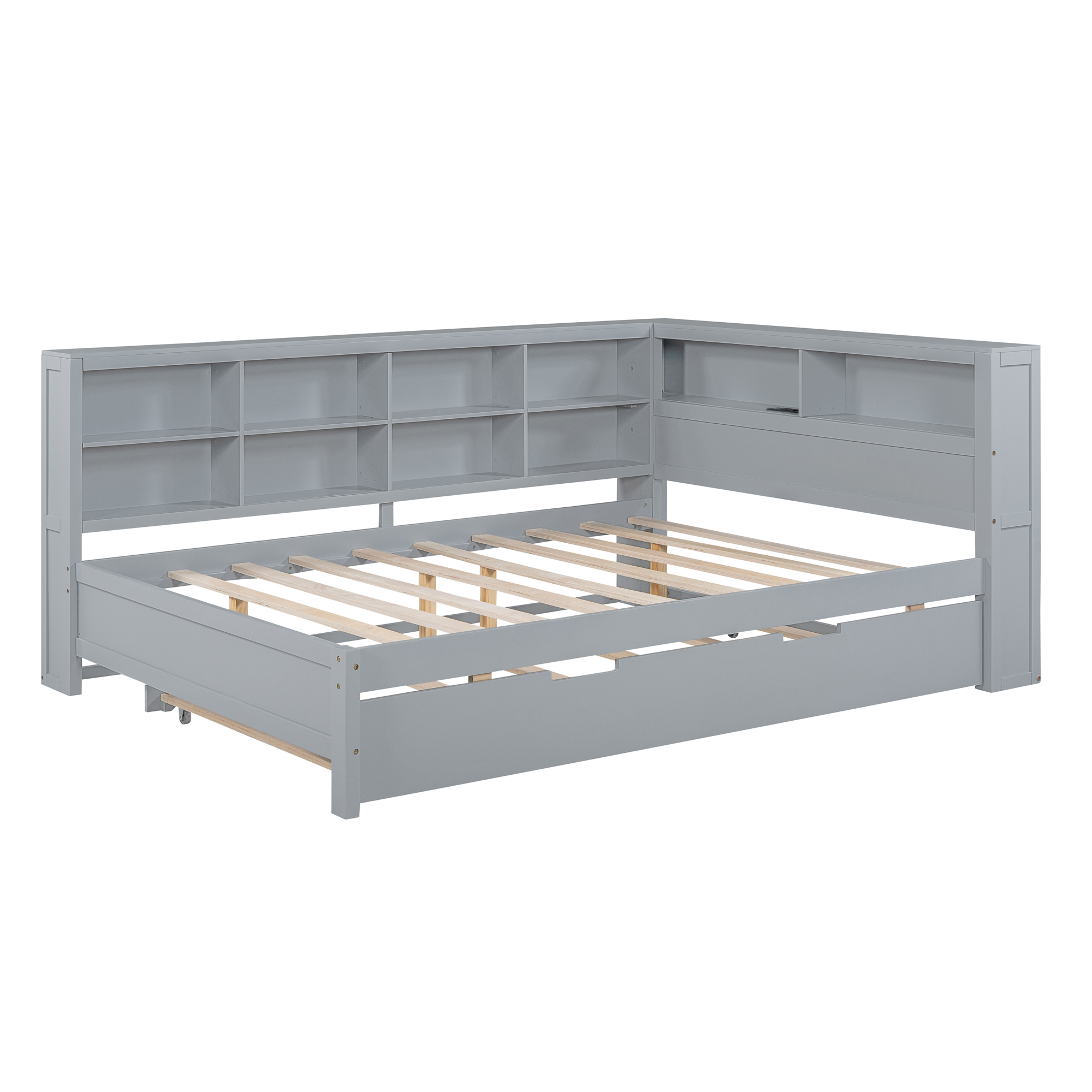 Wooden Full Size DayBed with Trundle, DayBed with Storage Shelf and USB Charging Ports, Grey
