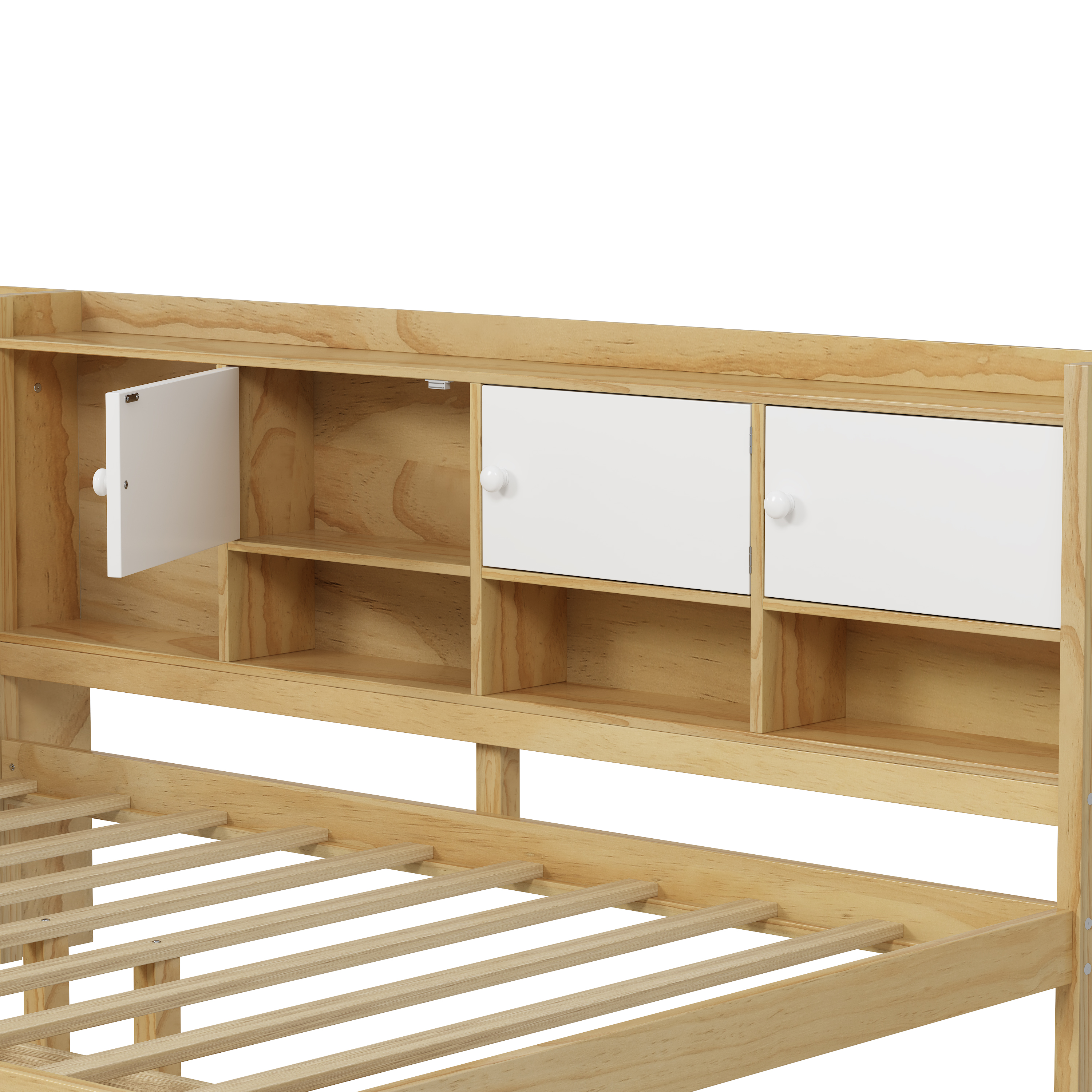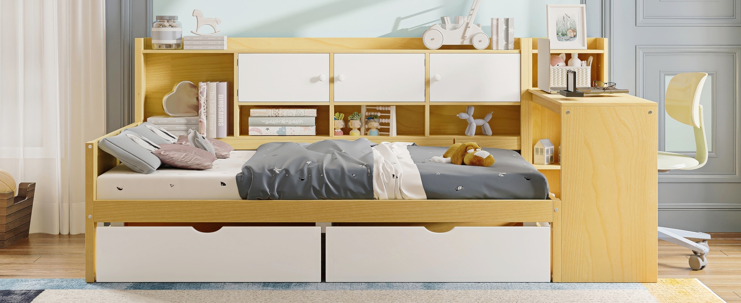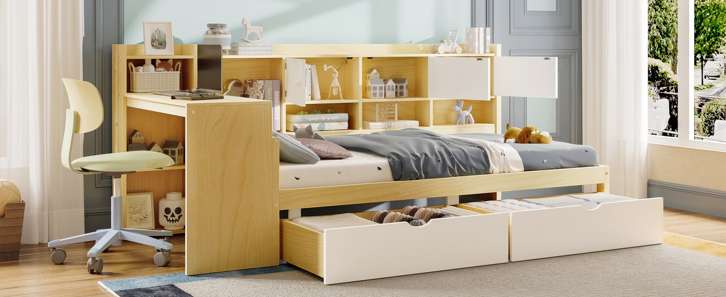 Product Name:Wooden L-Shape Daybed with Seven Storage Cabinets and Two Storage Drawers, Multi-functional Bed with Study Desk and Built-in Bookshelf, Natural+White