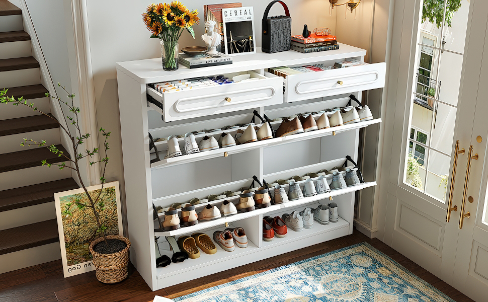 - [Space-Saving Flip Drawer Design]:The vertical flip-drawer structure maximizes storage while taking up minimal floor space. Ideal for apartments or narrow hallways, this shoes rack cabinet keeps shoes hidden from view and protects them from dust.