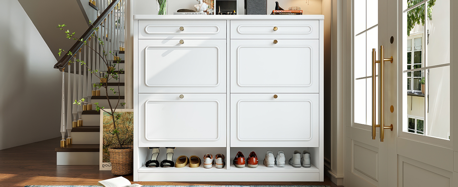 Keep your home organized and stylish with this Wooden Shoe Cabinet with 4 Flip Drawers and 2 Storage Drawers. Designed for modern living, this cabinet offers a smart classified storage solution that hides shoes neatly while keeping essentials within reach. The space-saving flip drawer design allows you to store multiple pairs of shoes without occupying excessive floor space, making it perfect for small apartments, condos or narrow entryways. Two additional top drawers provide convenient storage for everyday items like keys, wallets, shoe care tools or accessories. Finished in a clean farmhouse-style white/black, this shoe rack cabinet complements a wide range of interior styles—from modern to rustic. Built with sturdy engineered wood, it delivers durability, stability and smooth daily use. Whether placed in your entryway, hallway or bedroom, this functional and elegant shoe cabinet helps create a tidy, welcoming home.