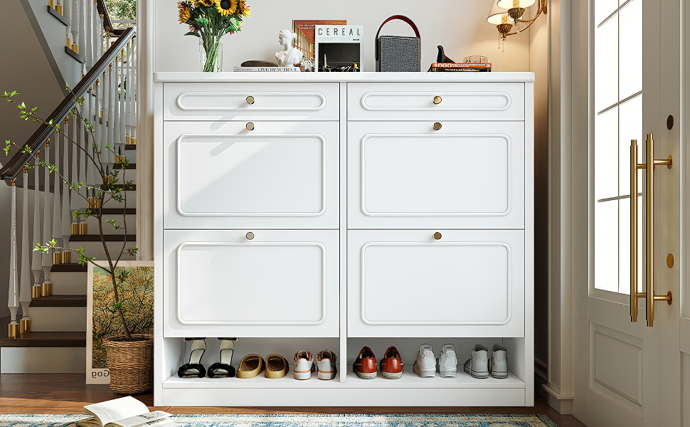 - [Large Capacity Shoe Storage Cabinet]:Designed with 4 flip drawers and 2 upper storage drawers, this wooden shoe cabinet provides classified storage for sneakers, boots, flats and daily essentials. Perfect for keeping your entryway, hallway or living room neat and clutter-free.