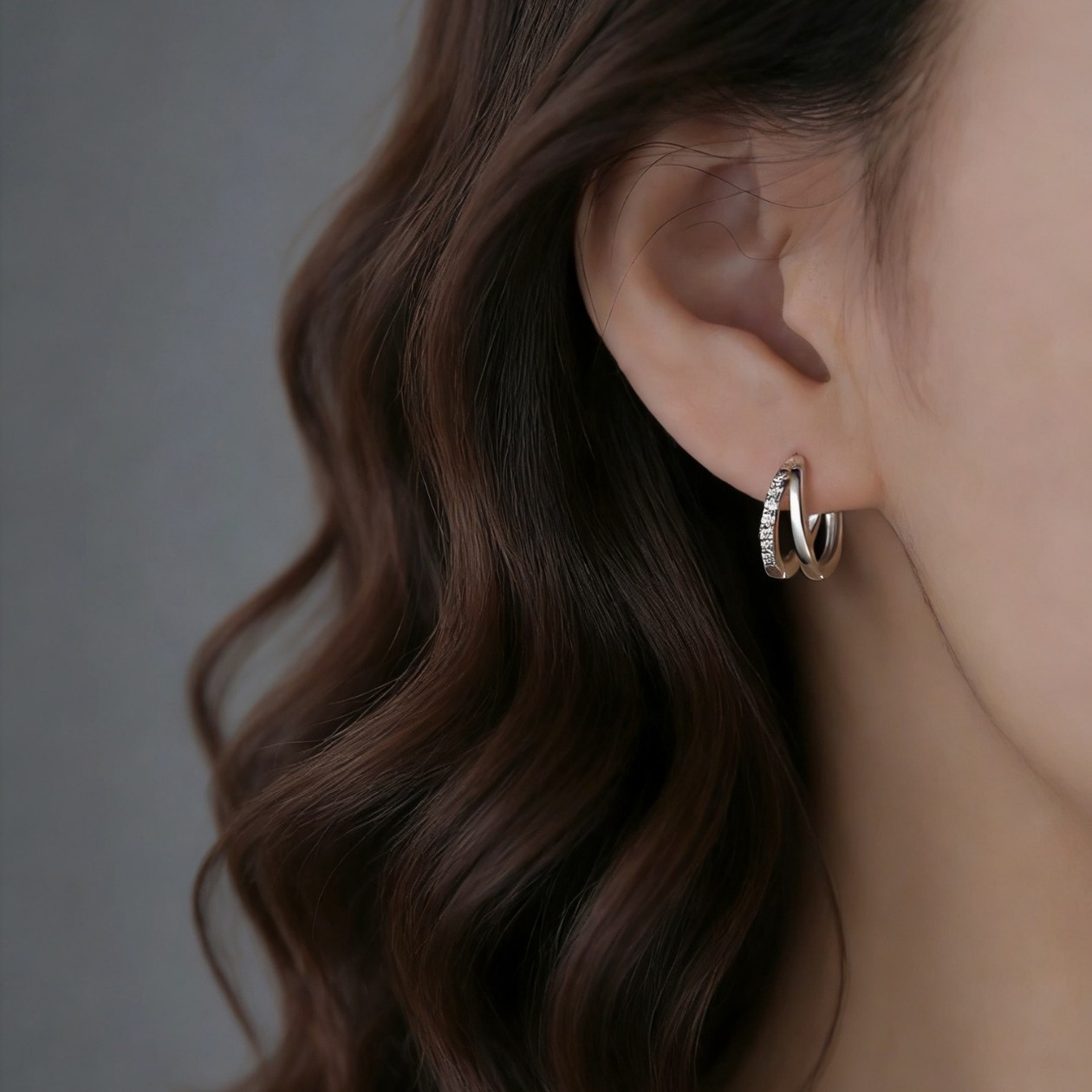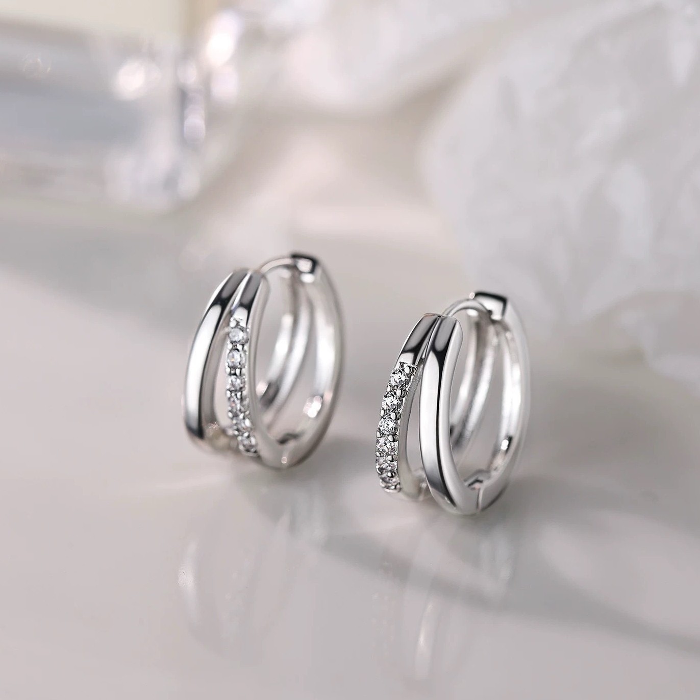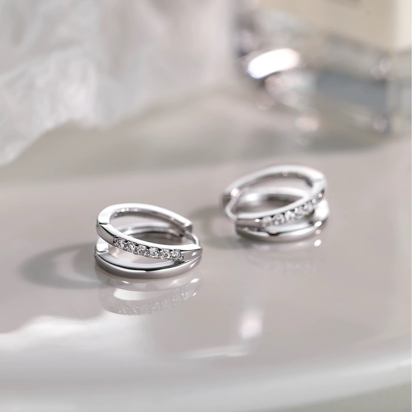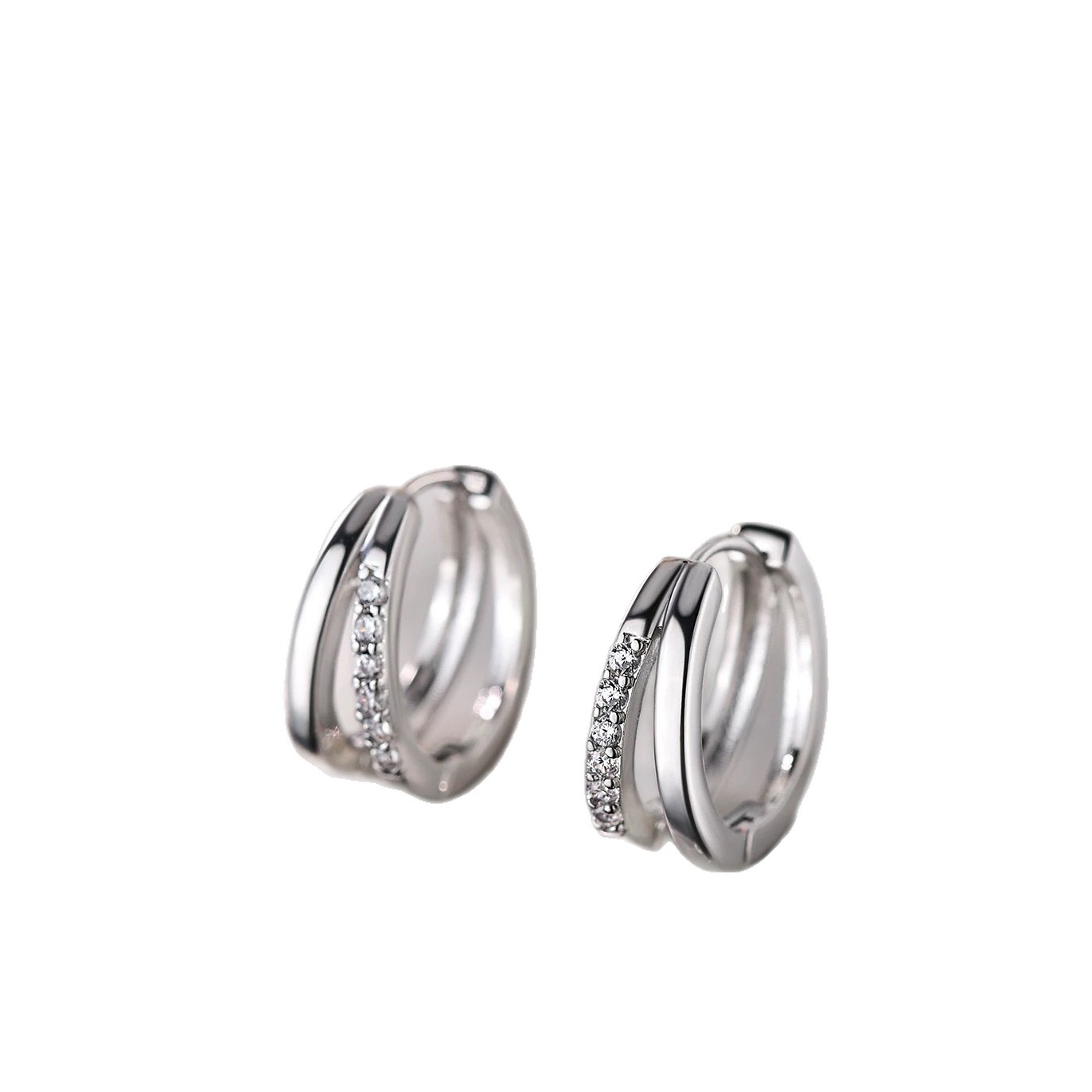 Zircon Inlaid Silver Plain Ring Double layer Ear Buckle